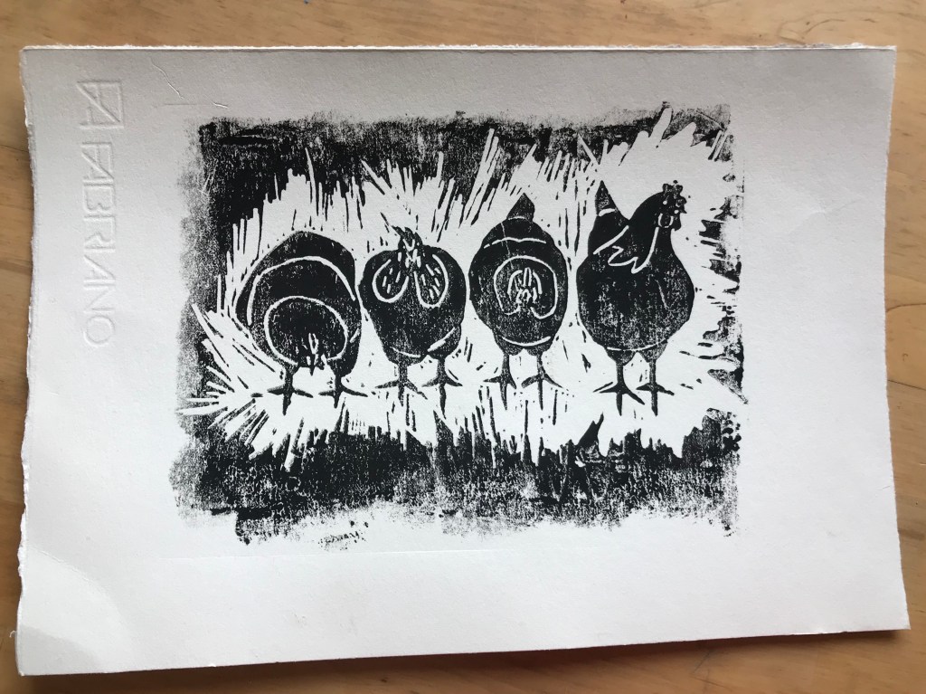 I bought some Lino and cutters last year, and didn’t want to allow myself down that particular rabbit hole when I had so many other things outstanding, but the current situation does feel rather disconnected and I find it difficult to relate projects to real time. So, it seemed the perfect opportunity to do something new and unconnected to anything normal. It took me ages to decide on a topic, as I love linocuts and couldn’t work out if I wanted to go naive or finely detailed, and whether to do a subject which was folksy and homespun or something more sophisticated and artistic. I settled on my chickens, as I am used to drawing them and I had a nice photo of a quad of hens I reared from chicks, and then sold to my friend. They are gorgeous big brown hens (Rhode Island Red cockerel over Light Sussex hens, for those who know about these things!):