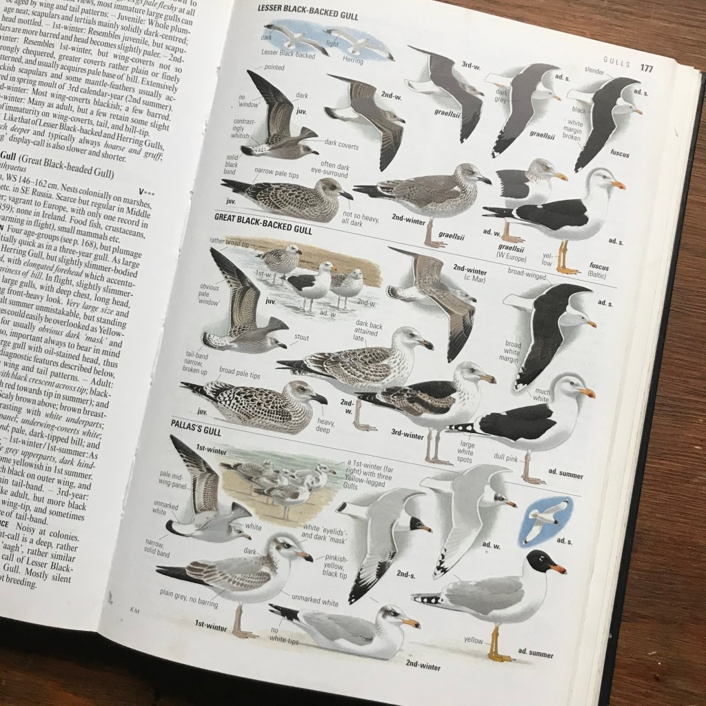 I find my well-thumbed Collins Bird Guide (above) indispensable for this sort of identification, but the black backs are magnificent and easily recognisable. Despite the rather thuggish behaviour and brutish appearance of Great Black-backed Gulls, they are a common bird around our coasts and towns and an easy one to spot for beginners.