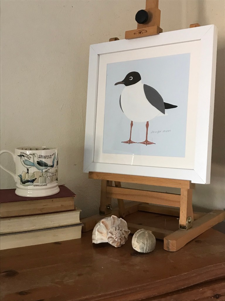 I remember seeing the Black-headed Gull with its spot of black during the winter compared to its full head in the summer. This makes them a really easy to identify, and they have a dainty build so seem more good-natured than many gulls, although I am sure their predilection for chips is the same as any other species. The black head is actually a 90%-cocoa-chocolate brown, so I added a smidgen of burnt umber to the lamp black when I paint them. They have a reddish bill and legs so I am able to use alizarin crimson, which along with indigo is a favourite colour of mine – I love the richness and high pigmentation of both.