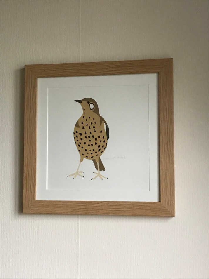 Mistle thrushes have an understated beauty with their brown and cream plumage, and spotted breast. Last year I found some beautiful – but rather decrepit – Victorian gold-painted wooden frames in an antique shop and thought they would be perfect for some book plates I’d recently bought from eBay. I took them to Newgate Gallery on one of my regular [pre-Covid] London trips and they framed them beautifully.