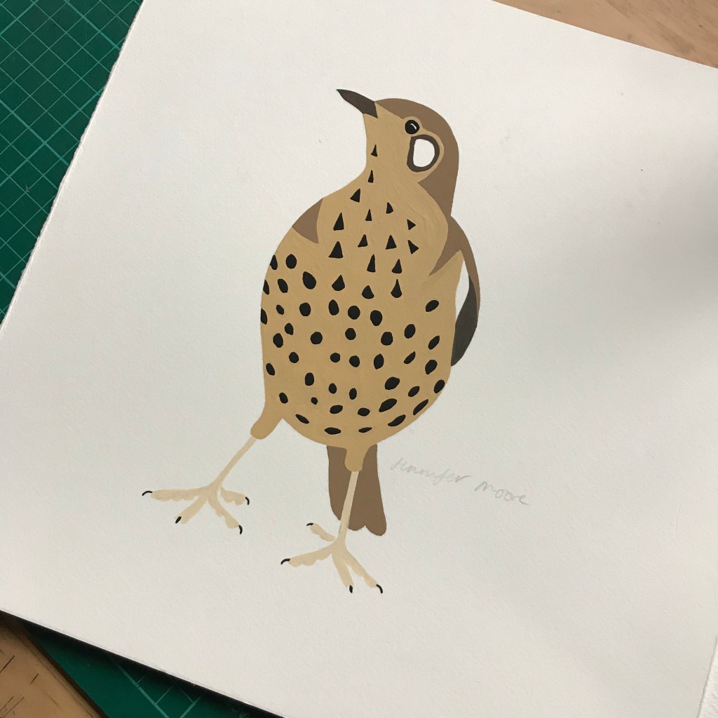 The mistle thrush I’ve painted is in a characteristic standing pose. The earth paints like ochre and umber are always ‘muddier’ than the higher grade pigments and it’s more difficult to get them to flow smoothly on the paper, but I love the colours.