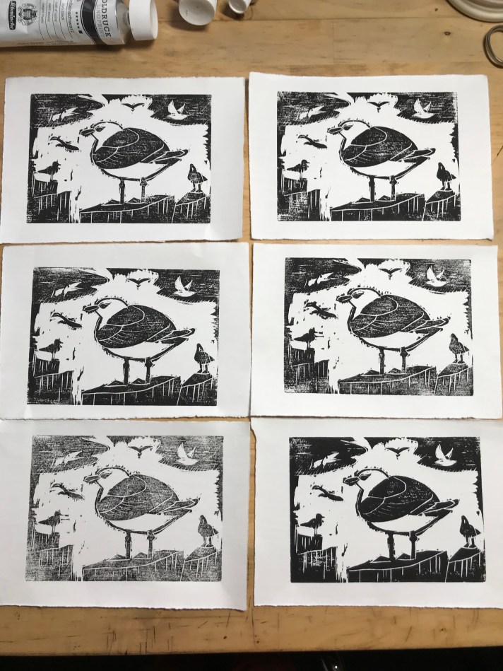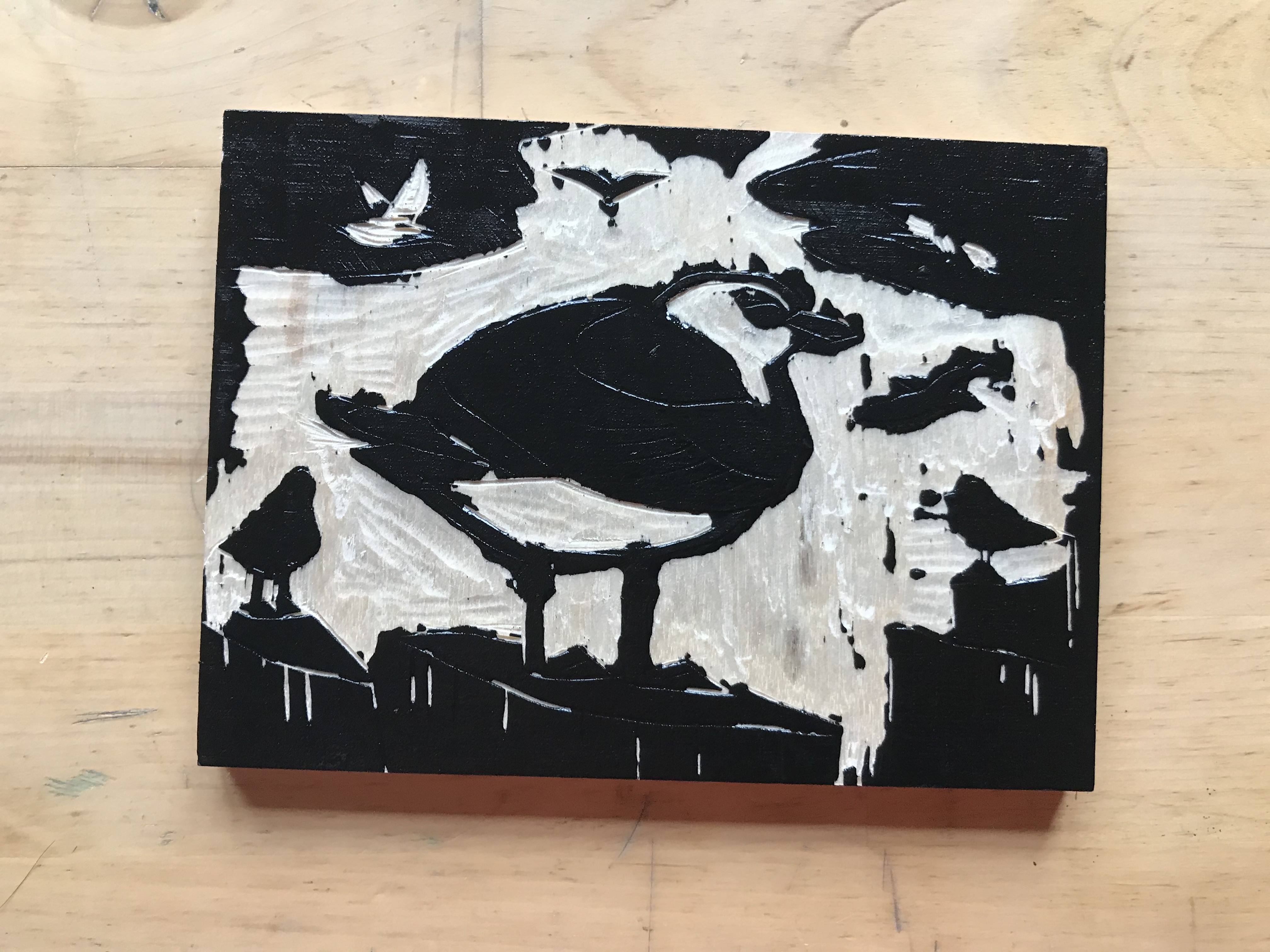 I had a go at a woodcut now that I have my beautiful new Pheil tools and a birch blank. I used a photo from Instagram as my main bird focus; a herring gull by Steve Evans: