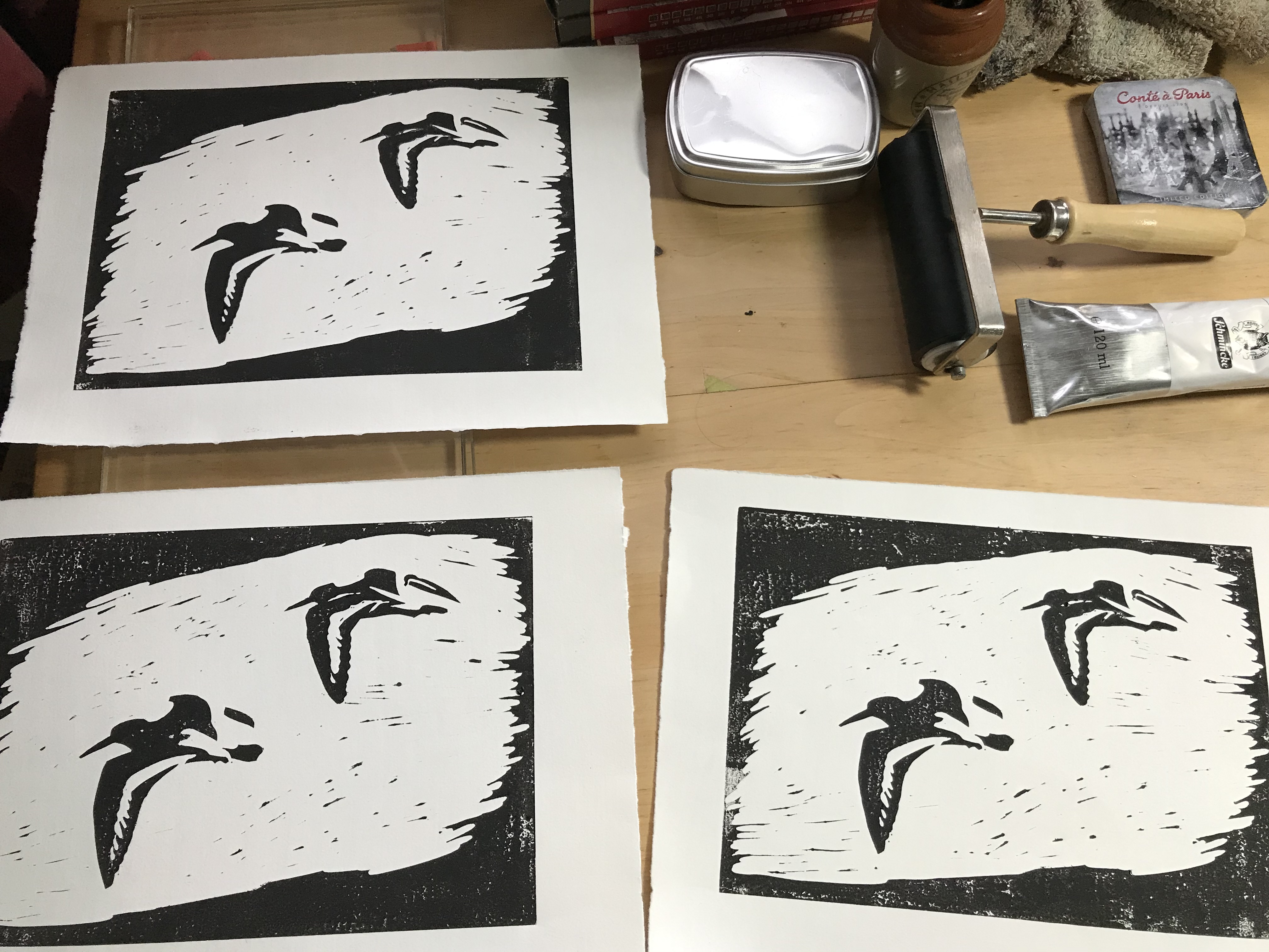 I added some companions to balance the composition, but realised as I was carving the block (which was a wonderfully enjoyable experience in itself) I was treating it like Lino. I am a self-taught artist, as although I have taken a foundation course in drawing, both my painting and printing is wholly experimental!