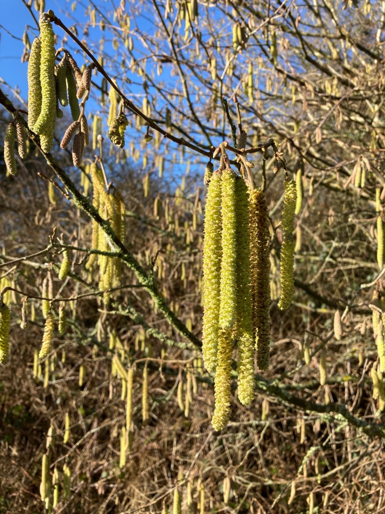 Earlier in the week I had noticed the hazel catkins on one particular tree had descended in the warmth of the sun; clearly the spot was perfect for an early show of pollen. I’m always amazed at the influence of these winter rays and the fortuitous gaps in the foliage allowing the low, watery light to hit the plant and encourage the catkins to unfurl. Other buds are tight and dormant, yet these were relishing the discernible warmth: