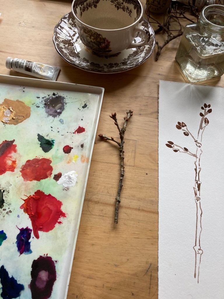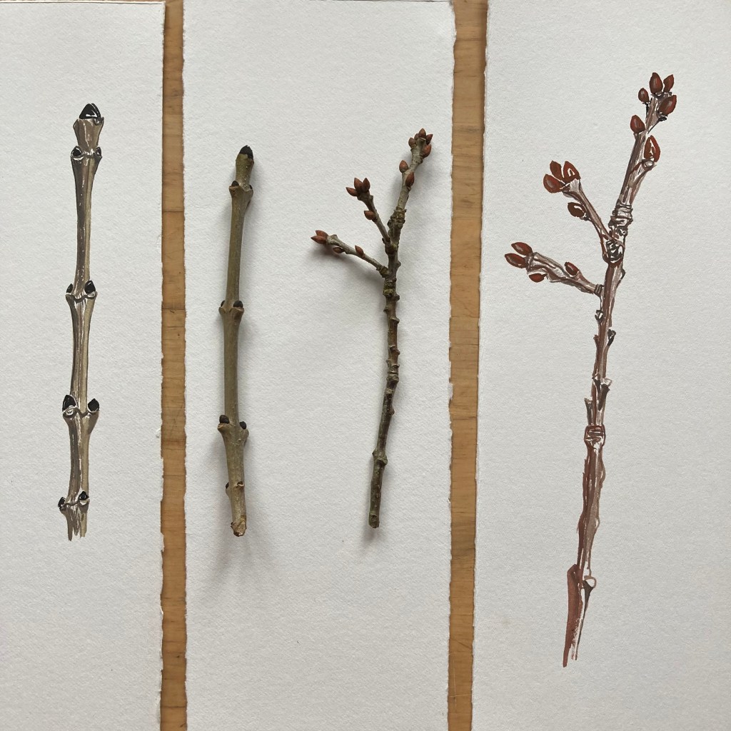 It is really lovely painting these twigs. It sounds odd, but they are so familiar to me, it’s like reconnecting with old friends, and just now, in February, they seem poised and ready to go; just a little more warmth and a little more sunlight, and they’ll be off, ready to start the cycle again. I am finding these rhythms comforting and reassuring at the moment, and welcome the undeniable (if rather predictable to highlight) promise of new growth.