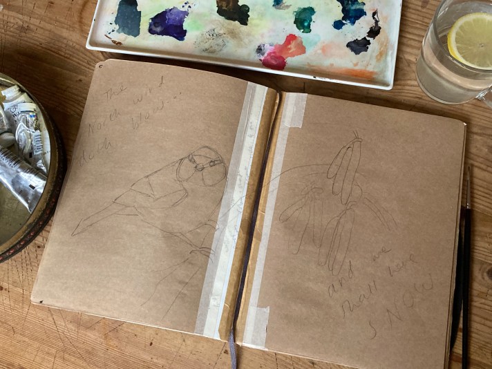 I recreated these little prints by pressing white gouache on to the page with a natural sponge…I probably should have used some gooey acrylic that wouldn’t have taken on the underlying brown hue of the Kraft paper but I have a ridiculous aversion to acrylic paint so stuck with the watery option. Likewise the snow blobbed on to the branches, but I had quite a bit of titanium white on my palette so seemed sensible to use it.