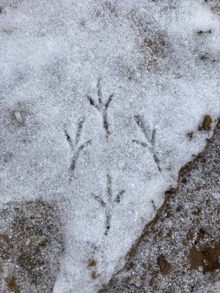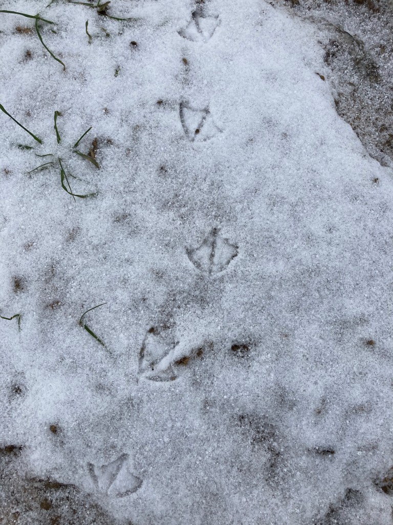 The snow has shown up some good tracks of the birds that are feeding in the fields; I noticed a group of six or seven fieldfare pecking among the worm casts, and the ever-present black-headed gulls cruising low – dropping several times a minute to pick up a morsel from the bare earth.