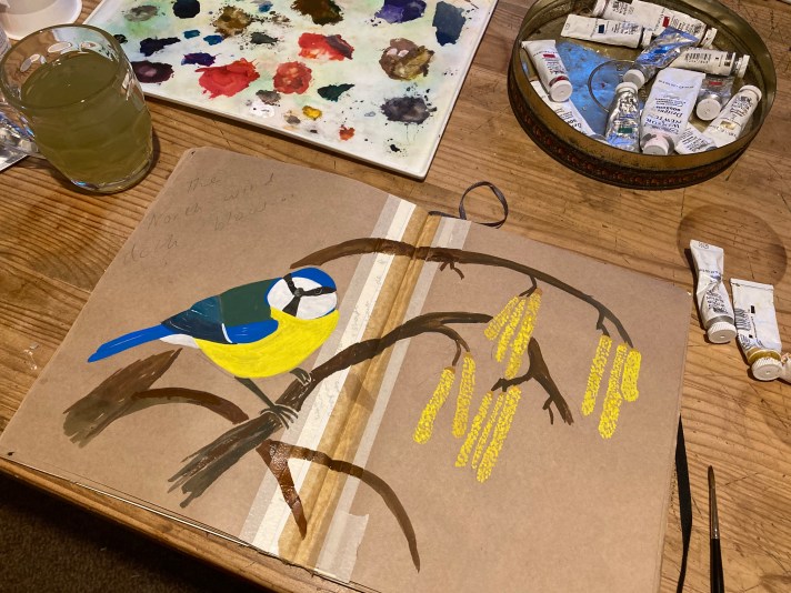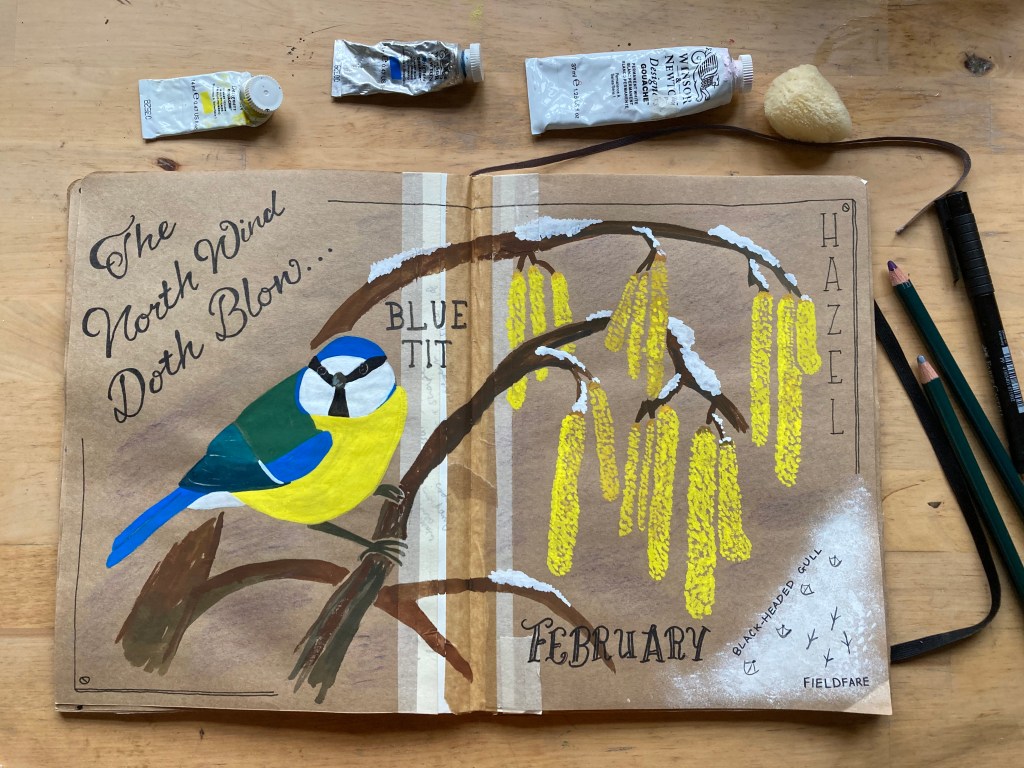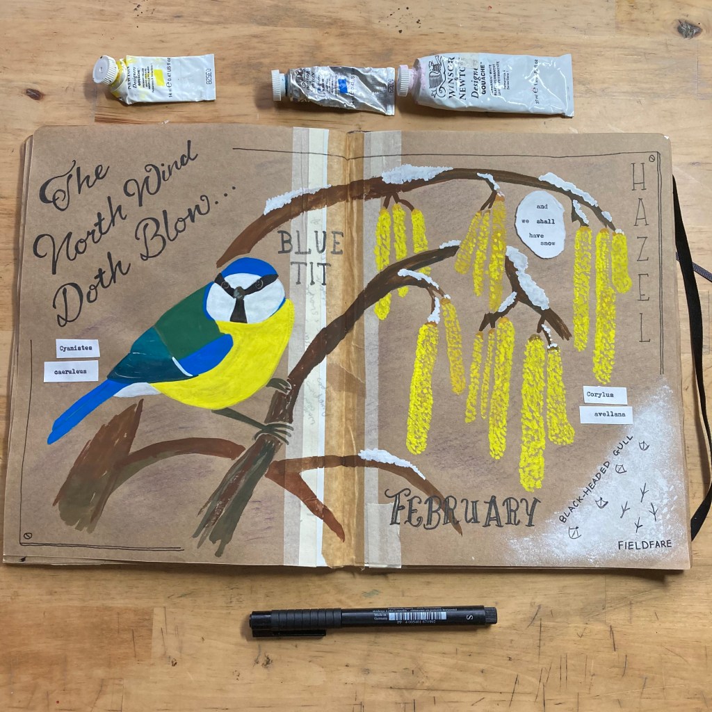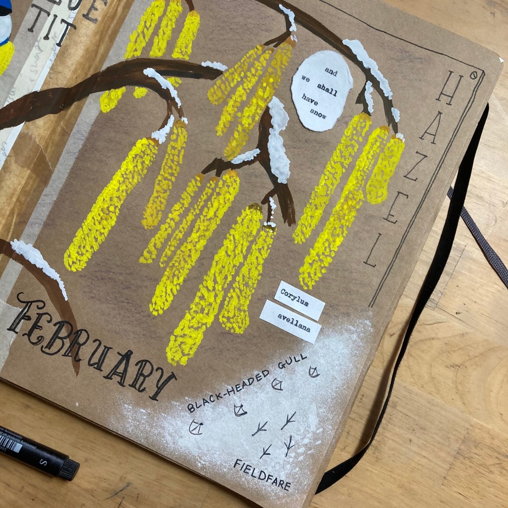 I found a nice reference photo of a blue tit in characteristic 90º angle pose on a twig, taken by Alistair Gorton on Instagram (@gortonalistair) so used this as my bird focus. I am running low on yellow paint but dunked my brush in to the tube and eked out enough to paint both the bird and the hazel catkins.
