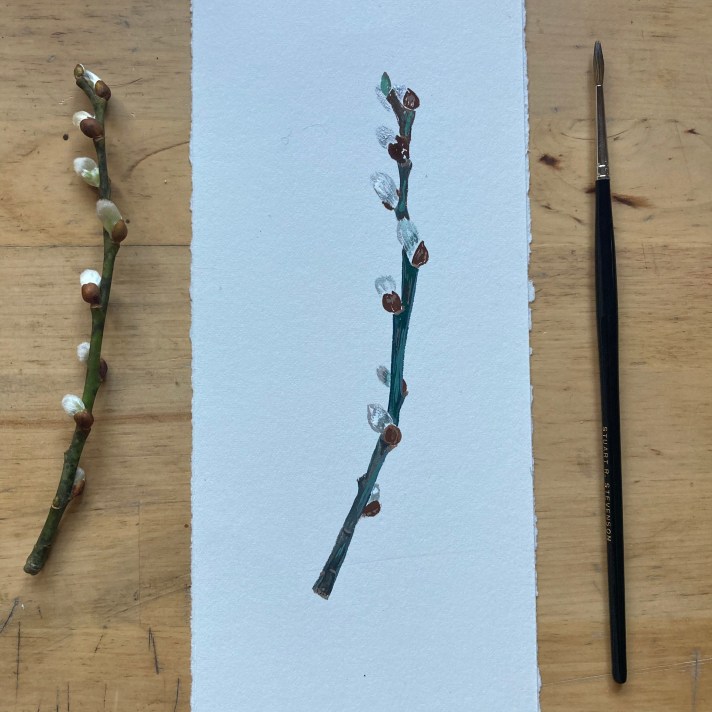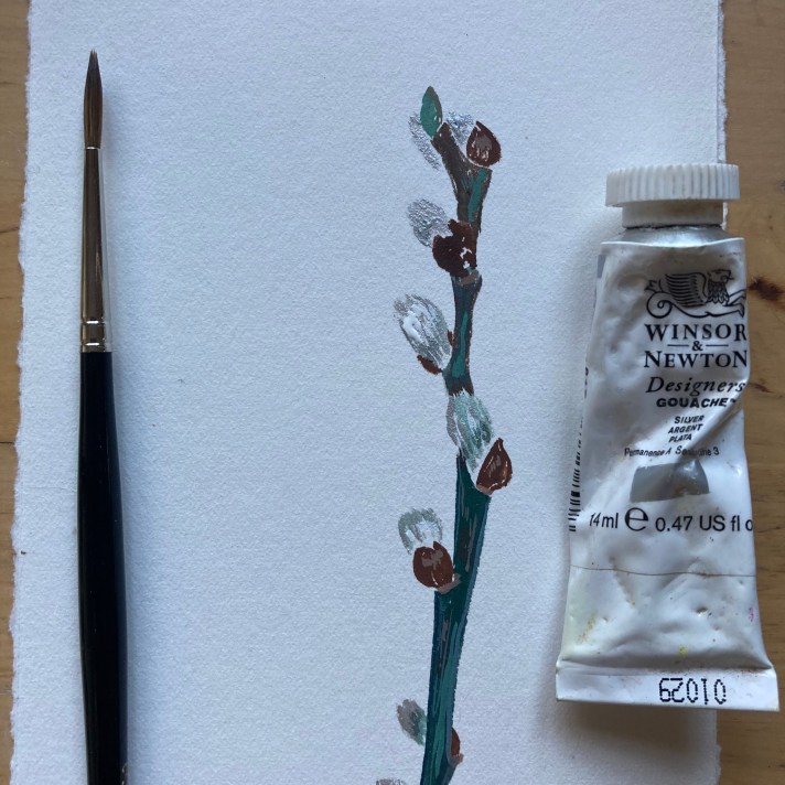 I’ve used a mixture of what-I-had-on-the-palette for the twig and silver for the buds, with some white and creamy-green highlights. Burnt umber matched the matte buds perfectly.