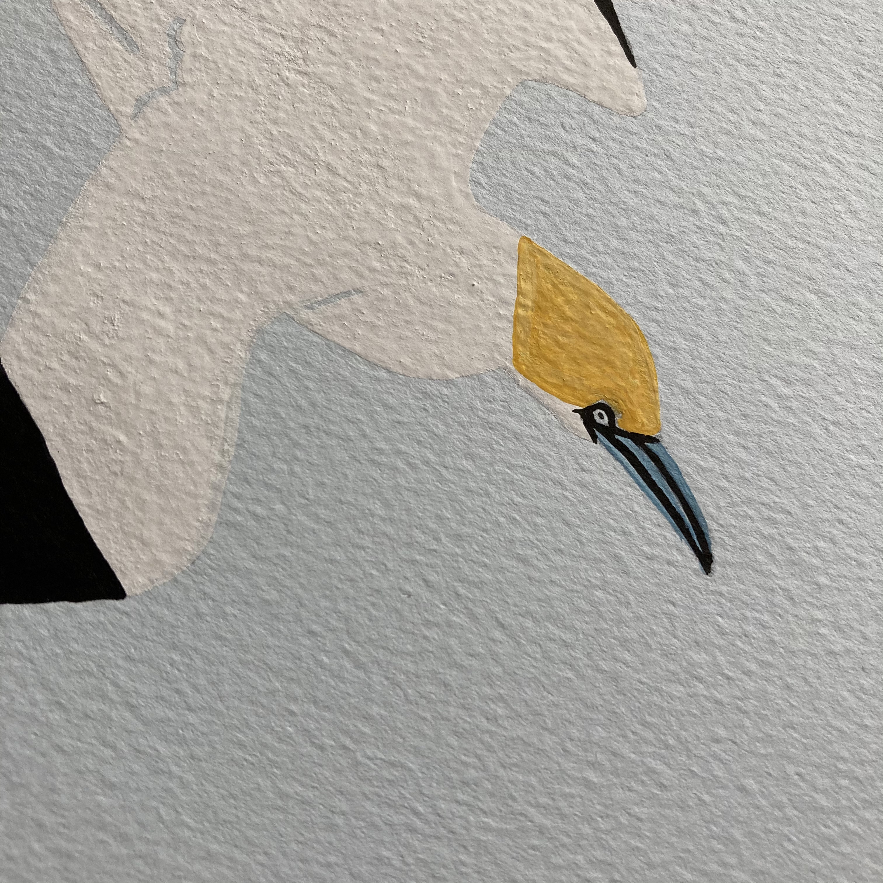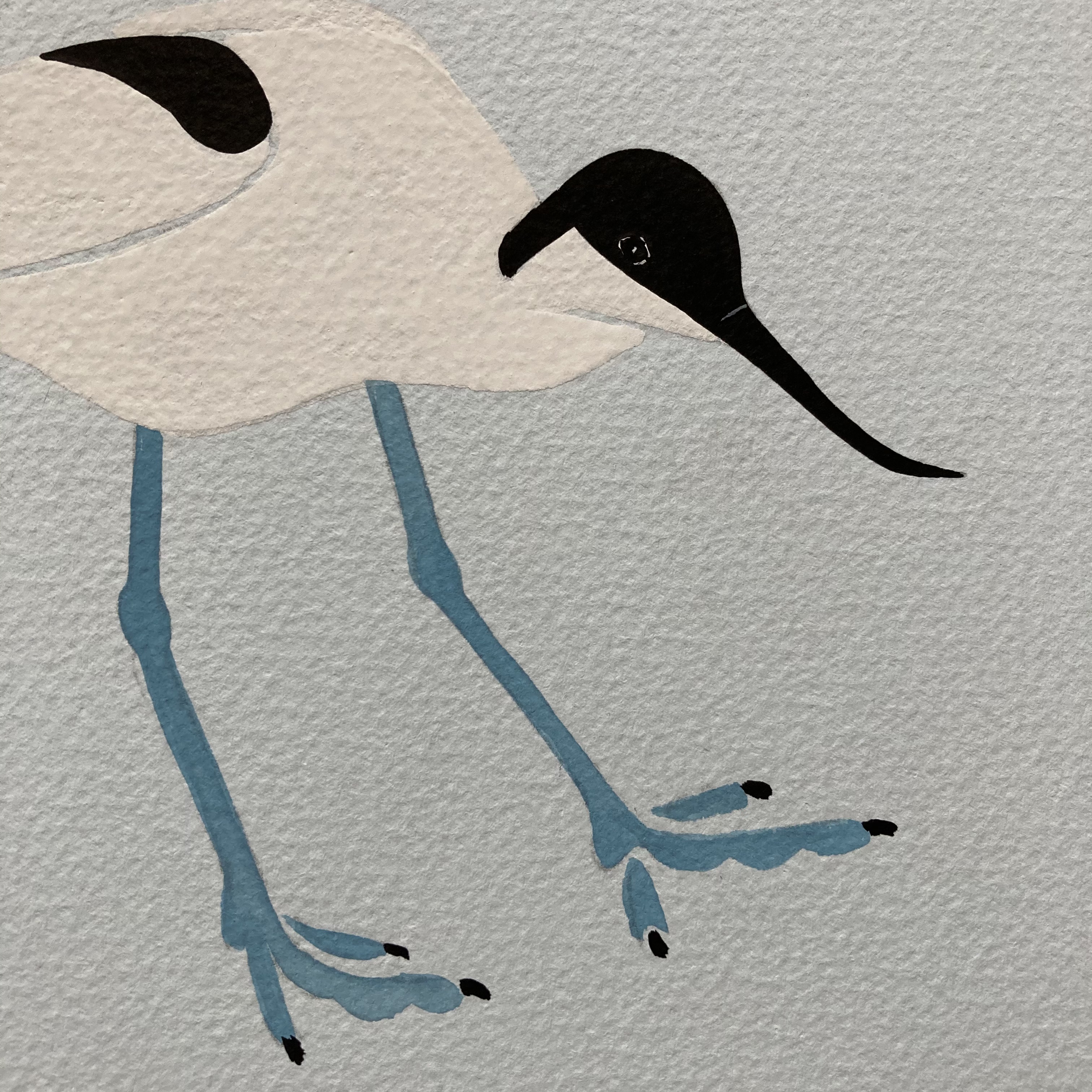 I love playing with the white space and the birds’ plumage but there are some which would just look disembodied, and on those occasions I use a lovely pale blue watercolour paper which sets off white black and grey really well.