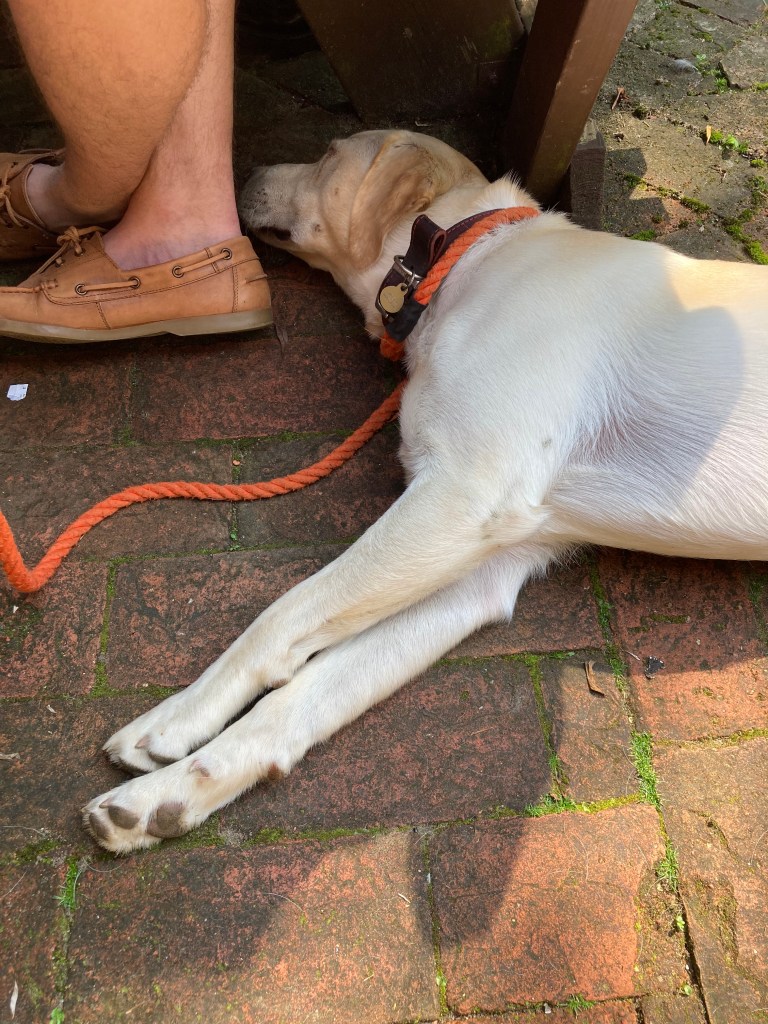 We stopped off at Chessell Pottery for tea and world famous cake (an entirely justified claim) and I filled in my logbook. Ned was getting the hang of lying down in the way: