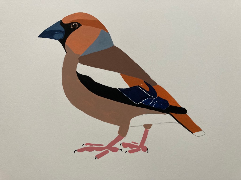 One bird on the list I have not seen but would love to – and they has been seen in some number so far this year in Sussex – is the Hawfinch. They have beautiful blocks of colour so suit my style well but I have not painted one before. That big beak makes them very front-heavy, like the tractor unit of an articulated lorry, and I had to check my drawing a few times as the head looks disproportionately large.