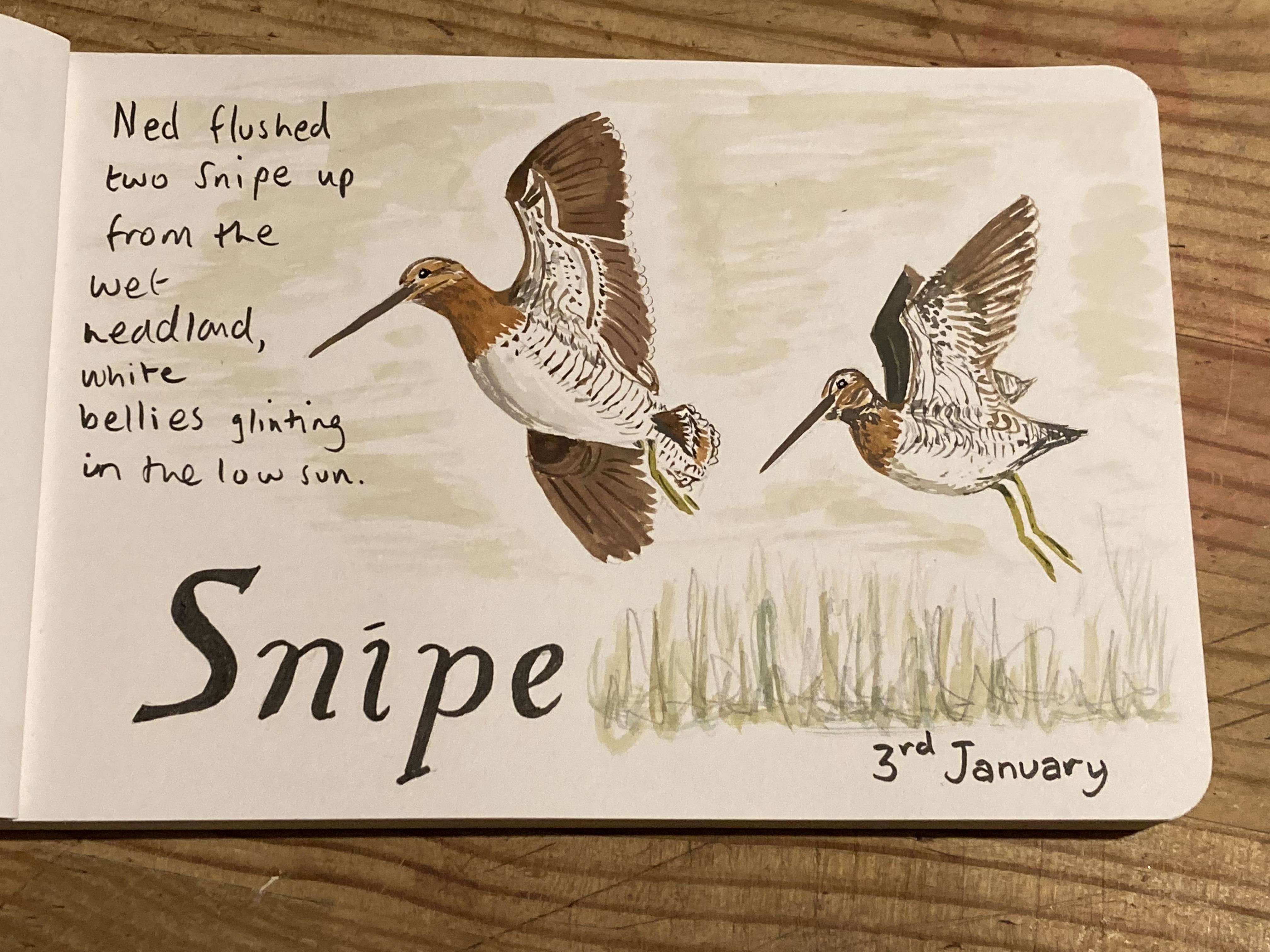 In the meantime, I am making the most of my immediate patch. For my Nature Notebook entry I have chosen Snipe, as they often poke around in the wet fields behind my house – although the land is intensively managed so not terribly rich pickings. There has been a pair, or two anyway, that often fly up explosively as my dog trots by, zig-zagging off and calling their little squeaky chirp before settling further down in the field.
