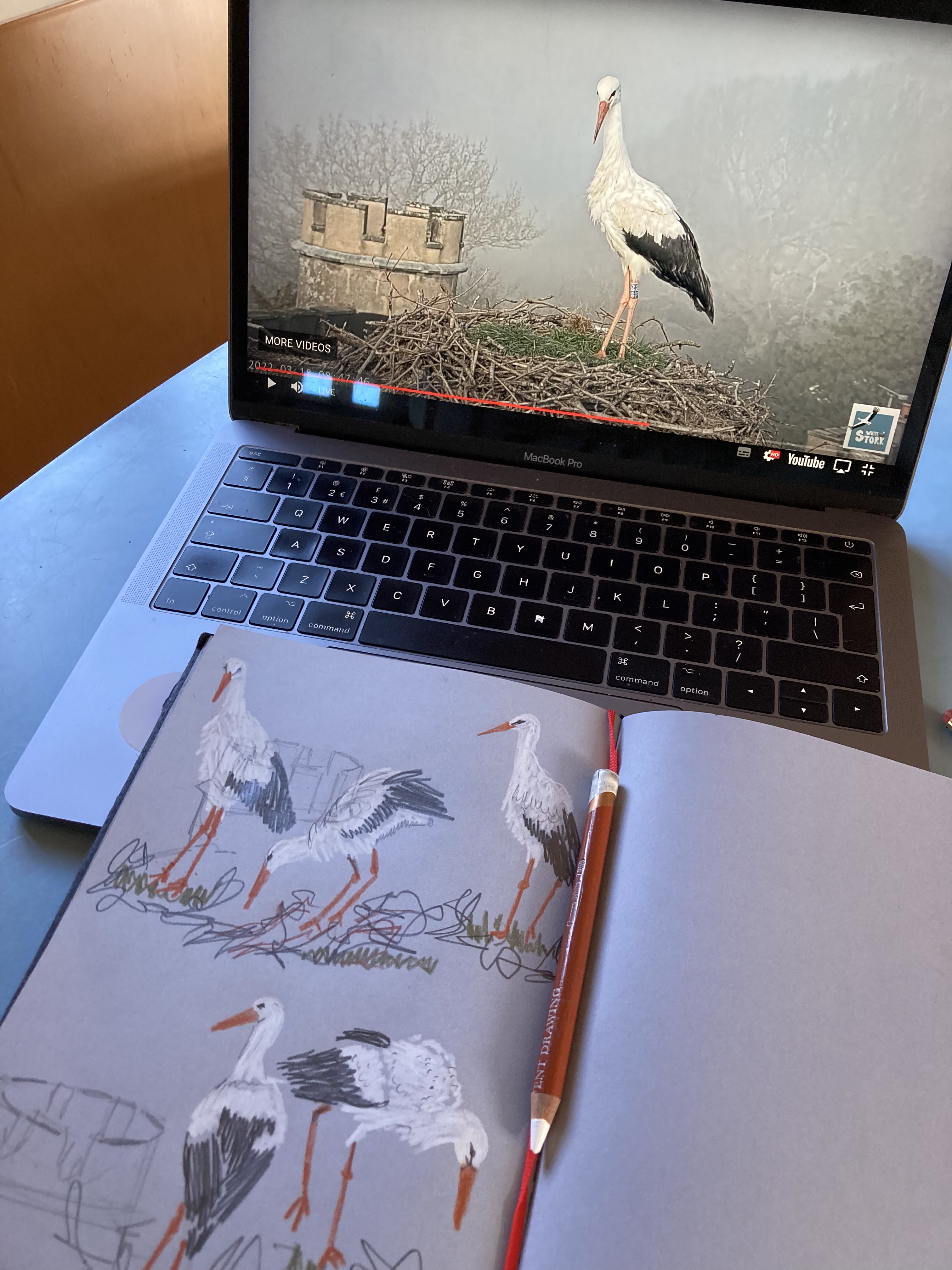Knepp Estate which is tantalisingly close to me (by which I mean it is not that far in miles but it’s a right pain to get to) are part of the White Stork reintroduction project initiative, and rather wonderfully, they have just installed a webcam on one of the active nests. As you will have reading a previous post, I like using webcams to practise sketching birds as it is better than using photographs. There are some amazing photographers out there but that in a way is the problem: the images are too good, too perfect, too clear and crisp. When field sketching, it’s important to learn how to capture a) something that is moving, and b) a bird in less than auspicious lighting or positioning. Being able to practise drawing the same bird from all angles is a great way to get the hang of foreshortening and seemingly weird proportions. For these sketches I did pause the camera as I am not familiar with the general body shape of White Storks, and even though these are unlikely to be on my personal patch any time soon, getting to know how birds of all shapes and sizes fit together is a useful skill.