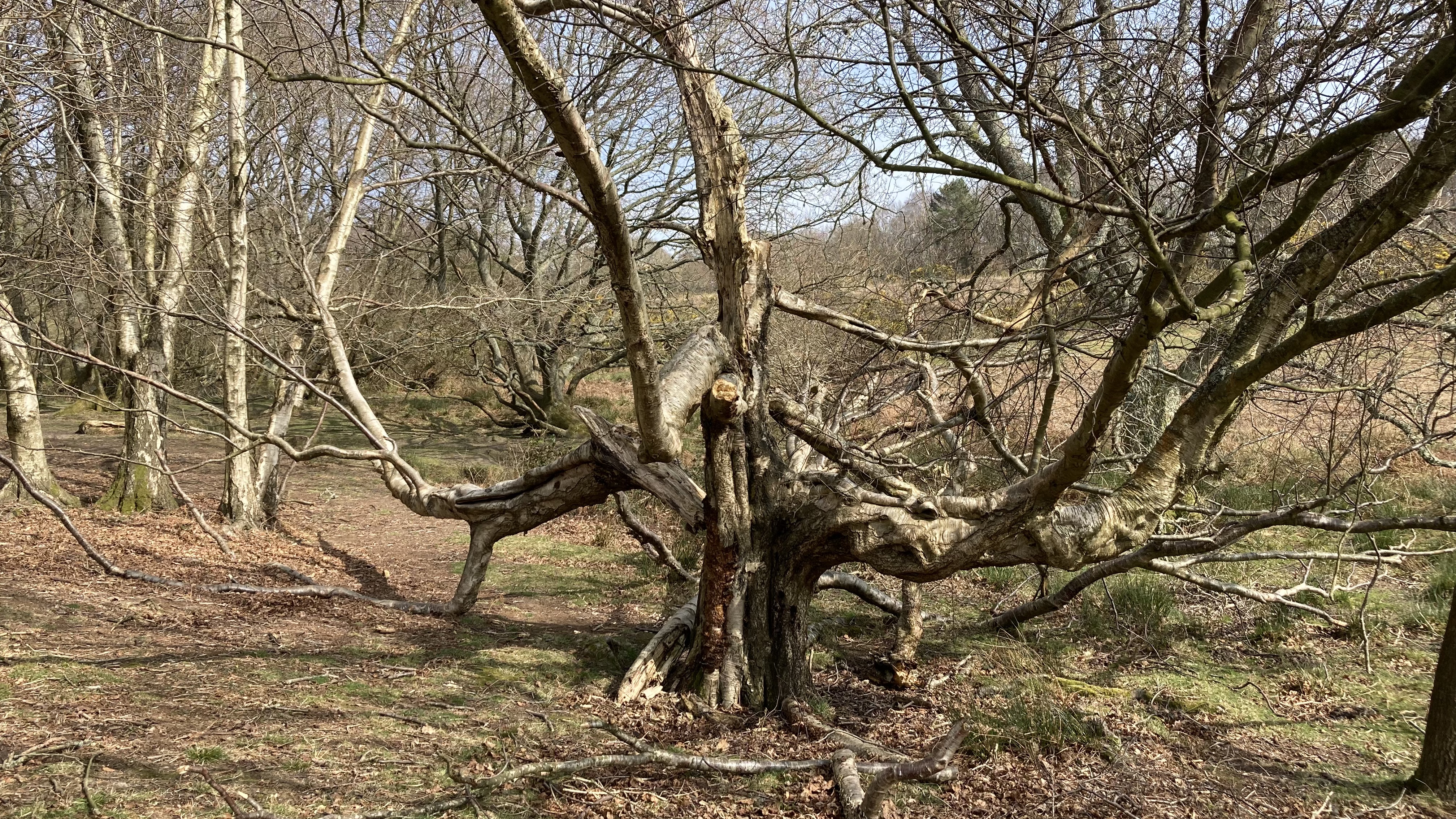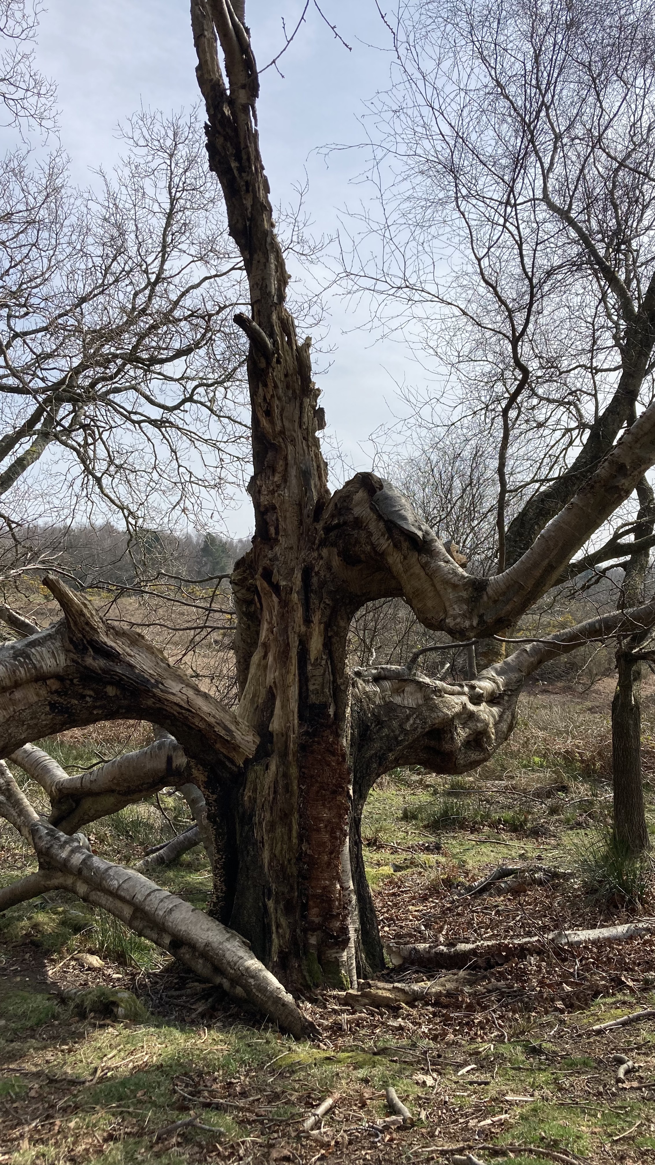On the way back, Ned found a muddy stream and I found an amazing tree, so we were both happy. I think this silver birch must have been struck by lightning at some point, but its supporting branches look like elbows propping it up. I wonder if it has rooted from those branches; if not, that particular limb is surviving from a tiny strip of retained cambium.