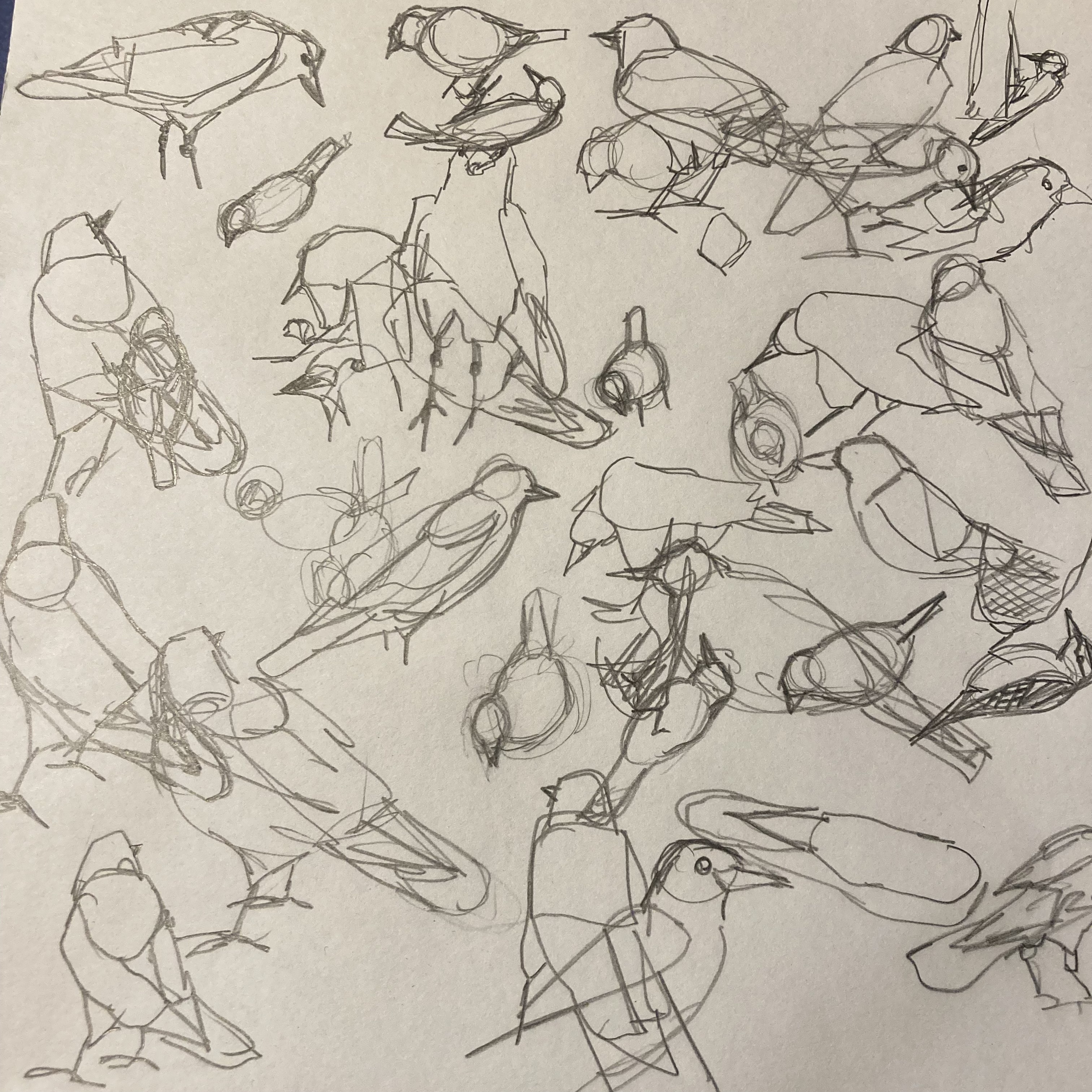 It’s been pretty horrible weather here in the UK for the last few weeks so my sketching practise has been confined to webcams. The Cornell Lab FeederWatch cams are great – especially the Sapsucker Woods one in Ithaca, where I was thrilled to see a Blue Jay and Mourning Doves. I drew lots of Redpolls and American Crows from the Ontario FeederWatch cam – I have a Birds of North America field guide that I bought from a second-hand bookstore in Chicago which has proven useful! I have done lots of scribbly sketches, some while on pause, some while the livestream is running.