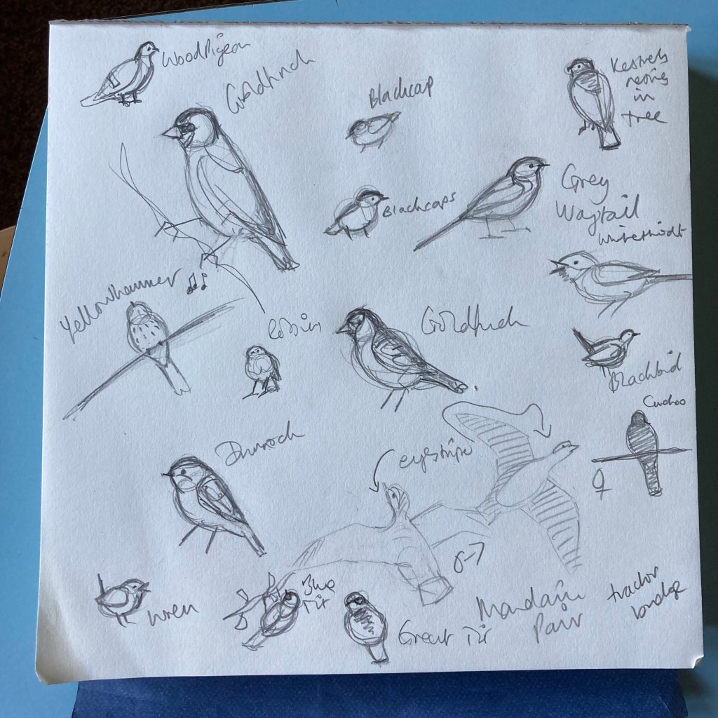 I do take a notebook and pen out with me but I find it difficult to concentrate when the dog is staring at me with his ball at my feet, and I only have one propelling pencil which I keep forgetting to take with me! So, I find it easier to sketch when I get home, drawing from the mental snapshots of the birds I’ve seen.