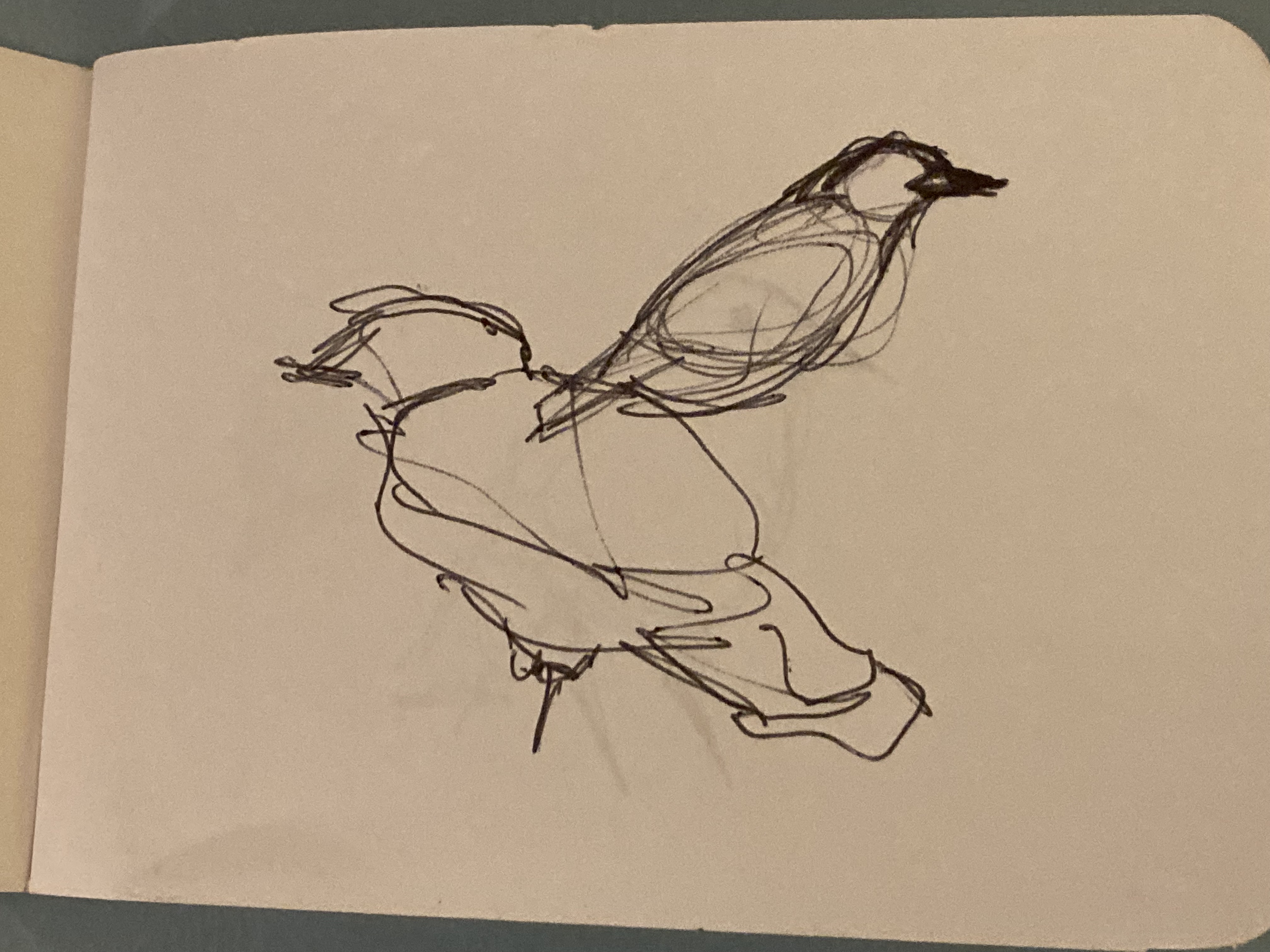 I’d managed to position myself at a table which was nice and handy for the dog, but did mean I couldn’t help but eavesdrop on a couple of ladies about my age, discussing their children’s further education options and I had to stop myself interjecting with agreement. I focussed on drawing but all I had in my bag was a tiny pad and a biro which didn’t look terribly convincing but I thoroughly enjoyed studying and watching the birds as they hopped about close to me. I am so keen to get back in to sketching and workshops; it’s so relaxing to observe them noting their shapes and characteristics.