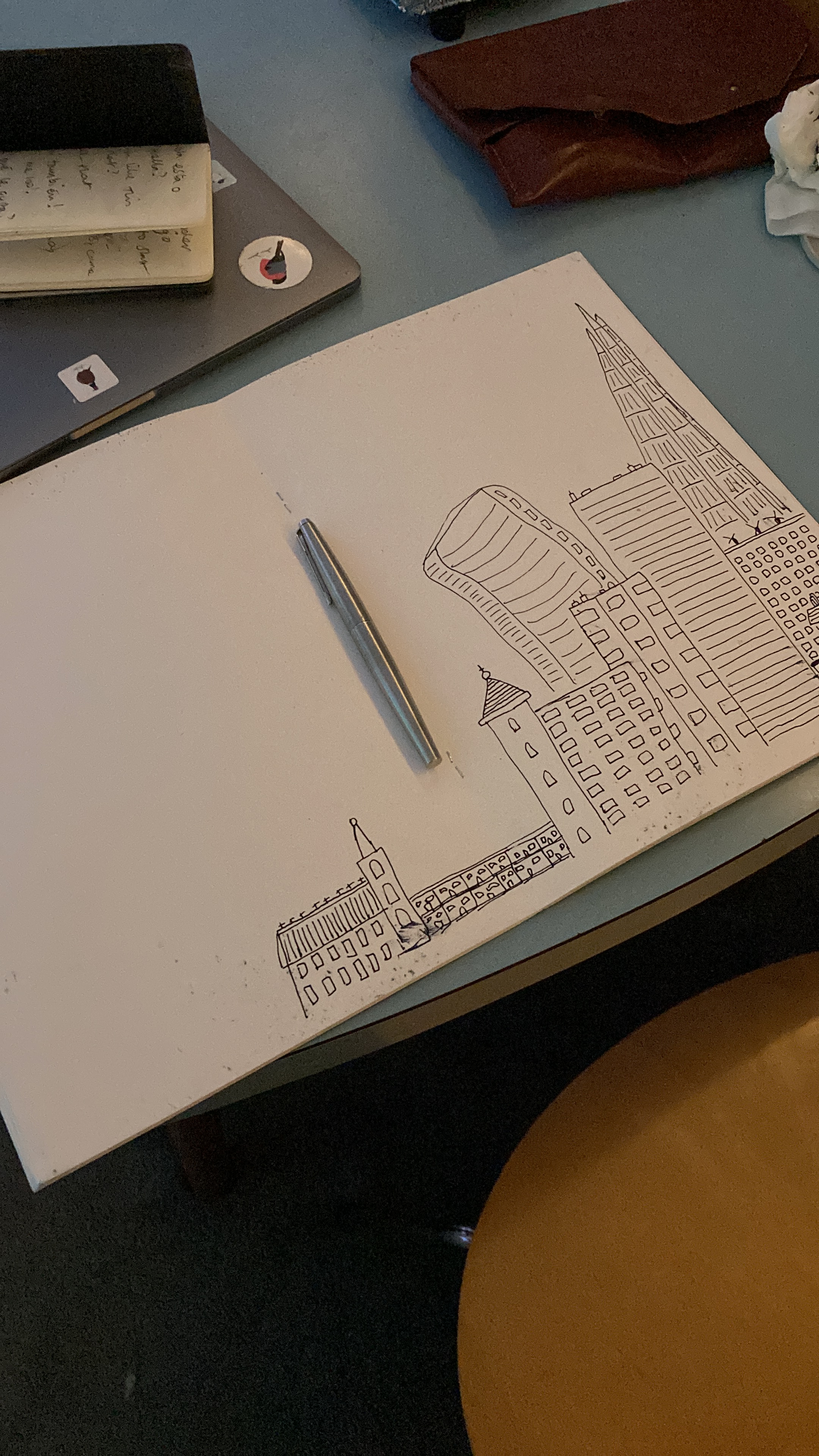 This is a very long-winded introduction to my cityscape doodle, on the centre spread of a regular 140gsm sketchbook I was given last year. I have used my Parker pen with Schreibtinte verdigris ink which I remember fondly from my days when I would go to London weekly for a day off.