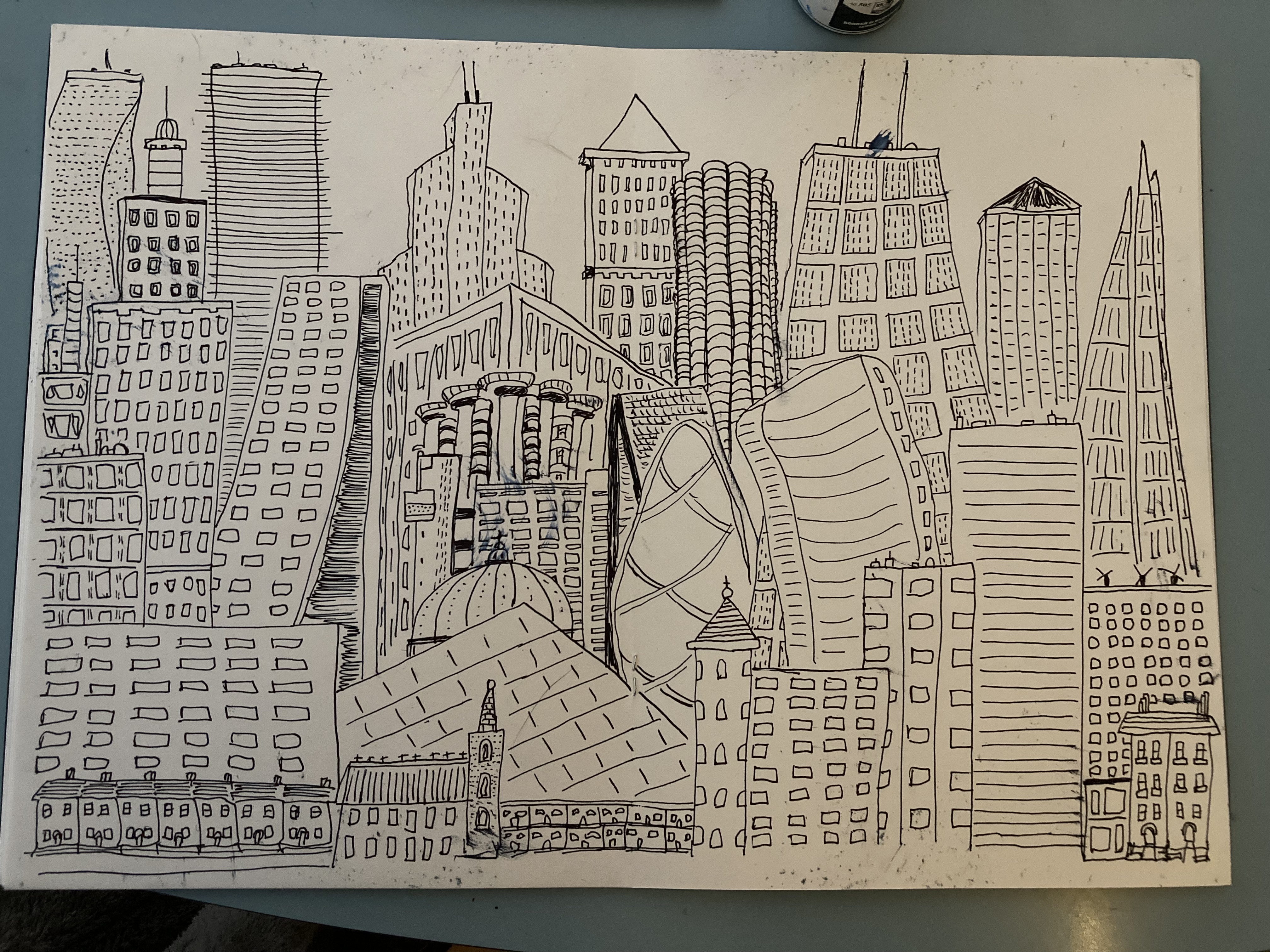 Having started my panorama with some generic boxy buildings I added The Shard and a couple of other City structures, and then something a little NYC-ish, followed by Trellick Tower and an approximation of St Paul’s. In went a few bits from Chicago, a fuzzy memory of the Louvre, and the Torres Blancas from Madrid which I spotted in my Atlas of Brutalist Architecture. All this punctuated with coffee, breakfast pancakes, and the backdrop rainy Paris jazz cafe on YouTube. Blissful.
