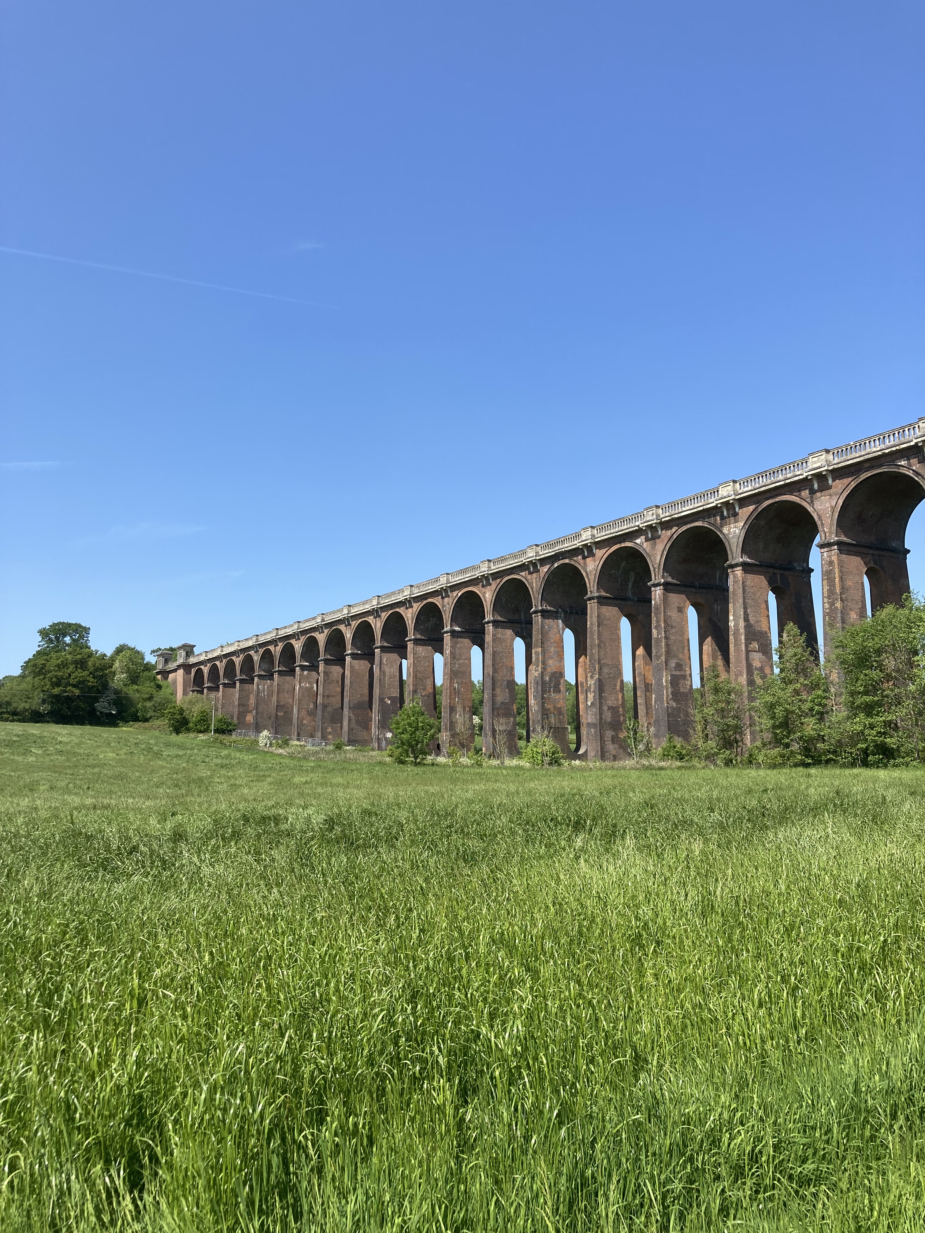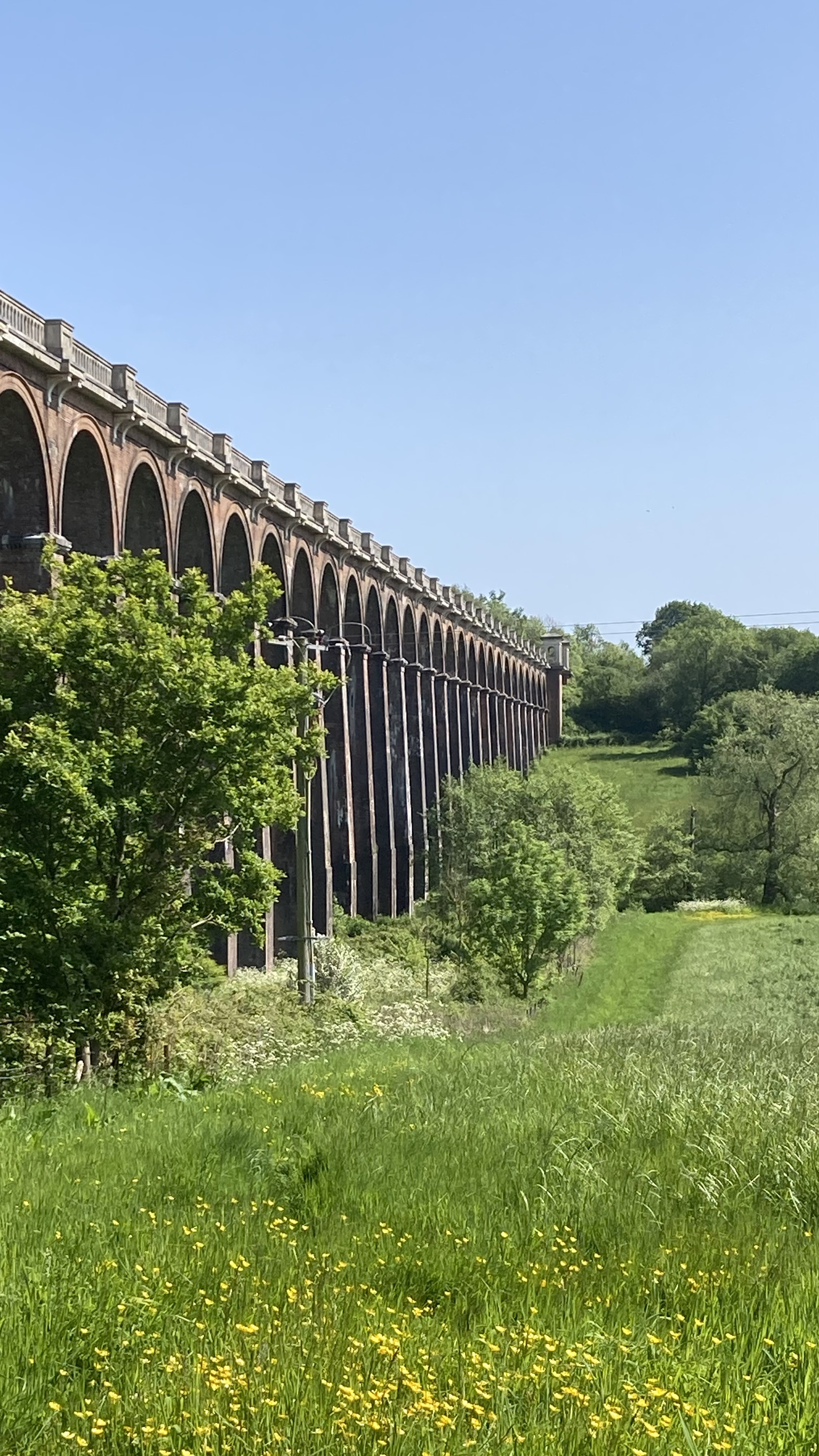 The first view of the viaduct was tantalising, and we decided to stop for lunch in the shade of a tree, sitting amongst the buttercups looking up at the massive brick structure, watching the trains we have frequently taken cross high up overhead.