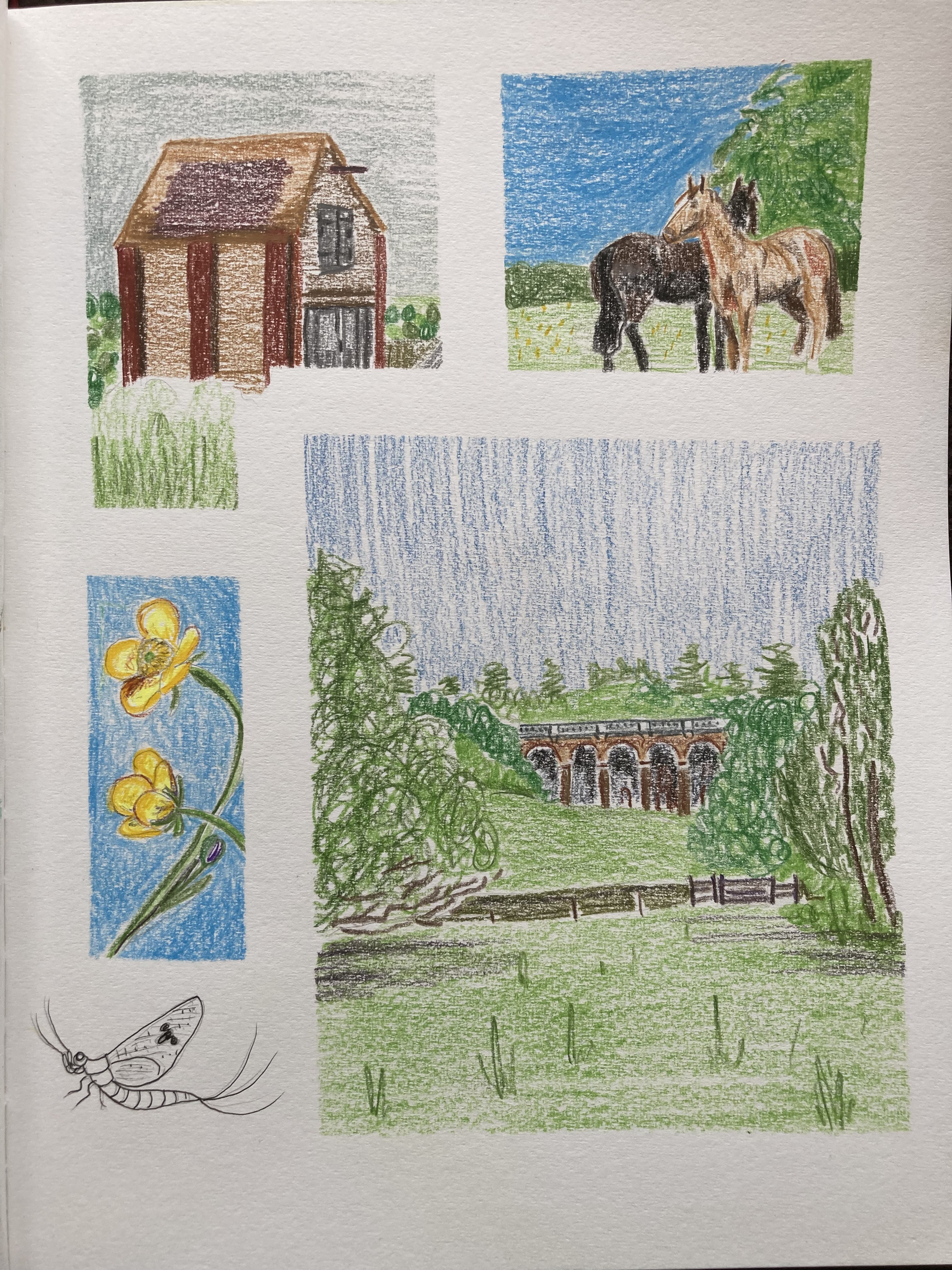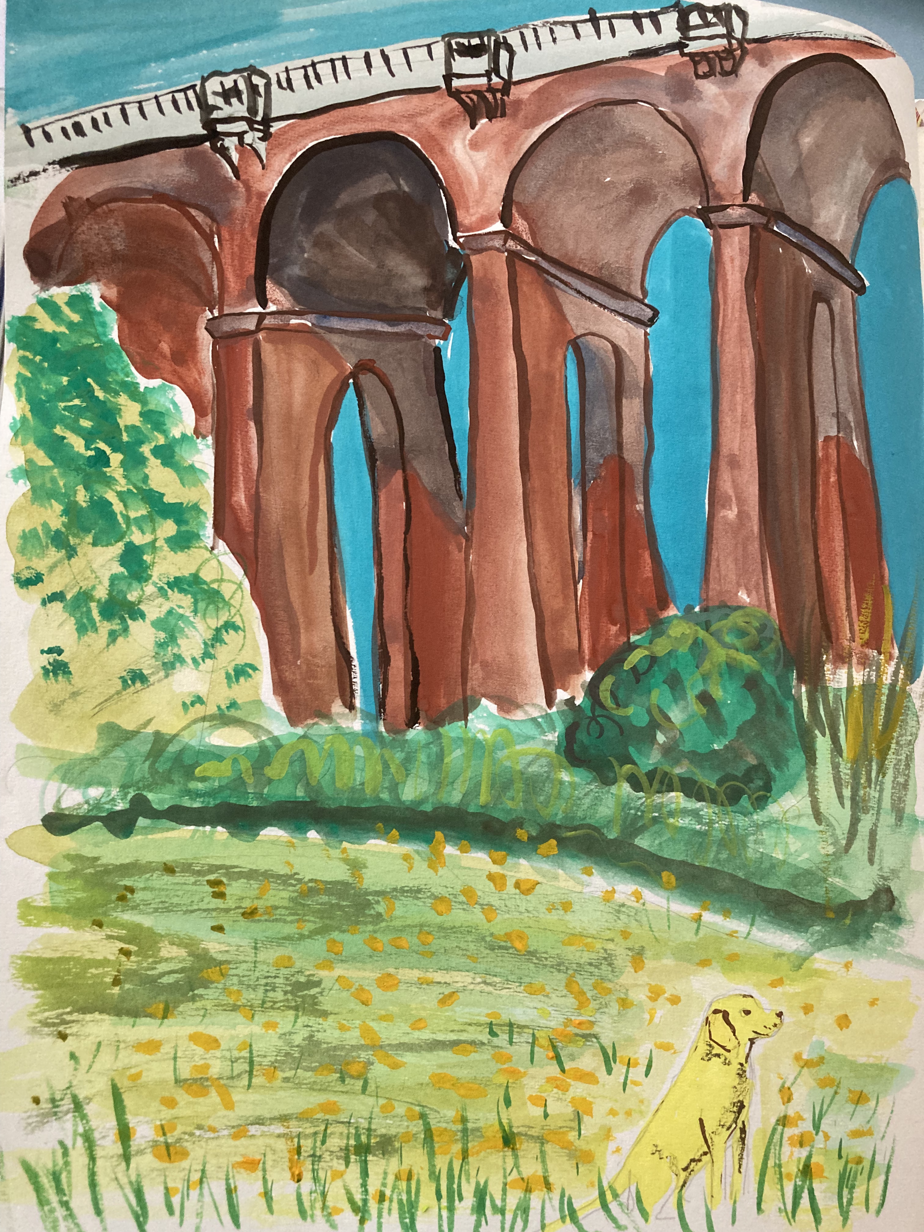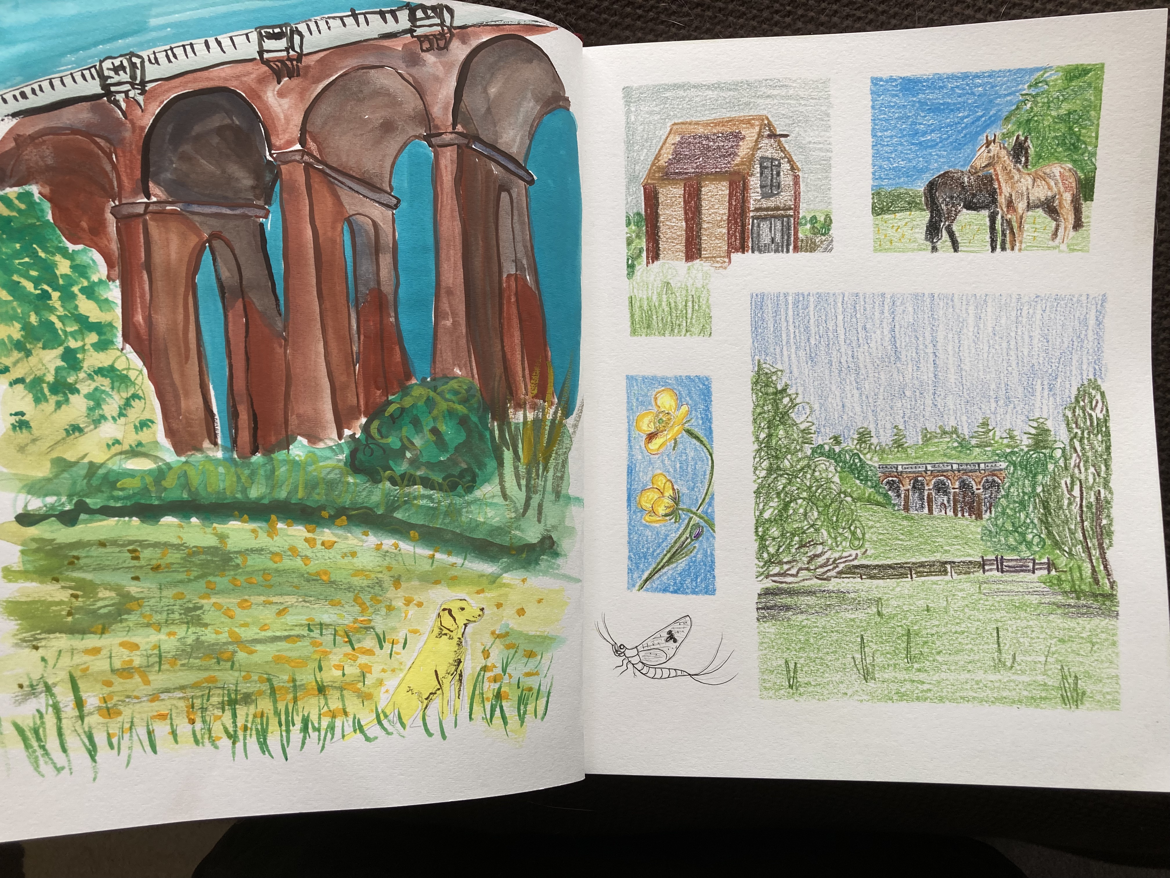 I wanted to record such a wonderful day in my sketchbook. I used gouache and coloured pencils: