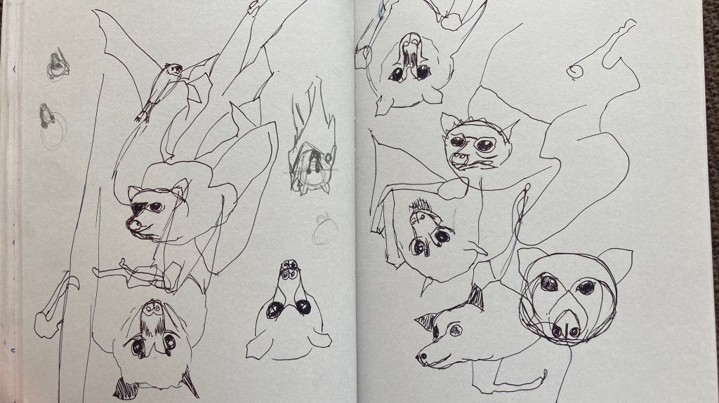 I had practised a little using the excellent resource pack sent out prior to the session, and all my bats looked a little bit mean…I’ve not drawn mammals much and I find getting them to look correctly foreshortened quite difficult when I’m also dealing with fur! It was good to get some basic shapes and a general understanding as the bats were very active so it was tricky to get more than some sketchy outlines. I am looking forward to revisiting the resource pack having seen the bats properly. It’s also slightly weird drawing them when they are upside down. Here are my practise sketches in my grey sketchbook with a fountain pen: