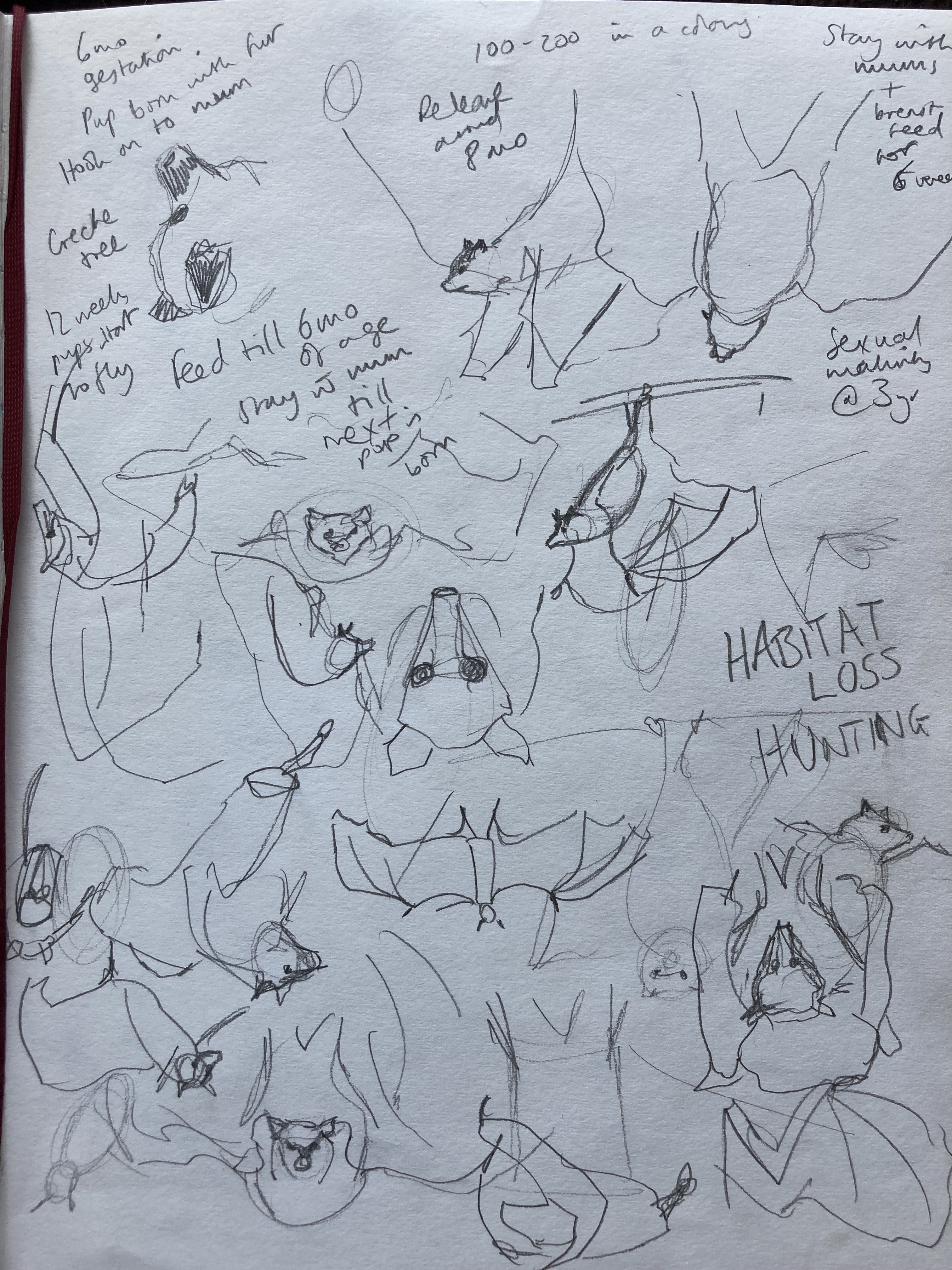 The anatomy of the bats is mind-blowing! Their wings are an incredible structure and I struggled a bit with orienting them as they used Tamara as a tree. My drawings were done with a Blackwing pencil in my Fabriano sketchbook.