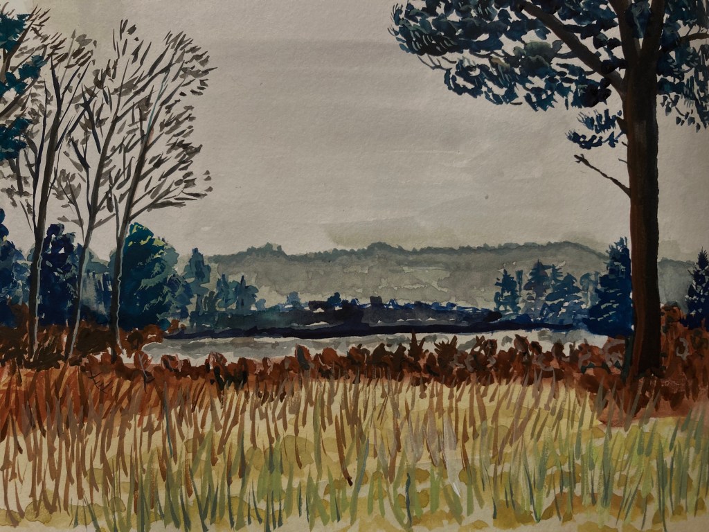 I decided I didn’t want to use the reference picture, and I didn’t look at this painting either, so it was more of an abstract, simplified or stylised landscape. I think indigo might be my favourite colour, and it was lovely to use. I used a really wet wash with the gouache, and I like the texture so I didn’t want to cover up the foreground with grasses.