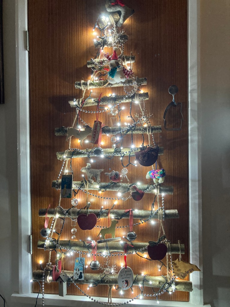 So far, so not very Blogmas and cheery. As my living quarters are quite cosy and compact, I have made myself a stick-and-string tree to hang on my eaves door; I made one for my daughter too who is living with her boyfriend at his family home and therefore they are also short on space.