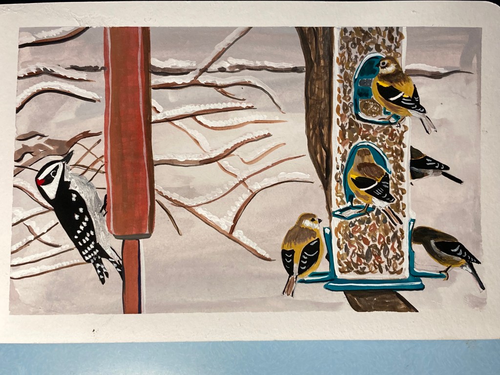 Having tried a few landscapes and watched various artists on YouTube, I was casting about for some inspiration for references images, and decided to try doing some birdscapes. I took some screenshots from the Cornell Lab feedercam so I could switch between the two while the gouache was drying.