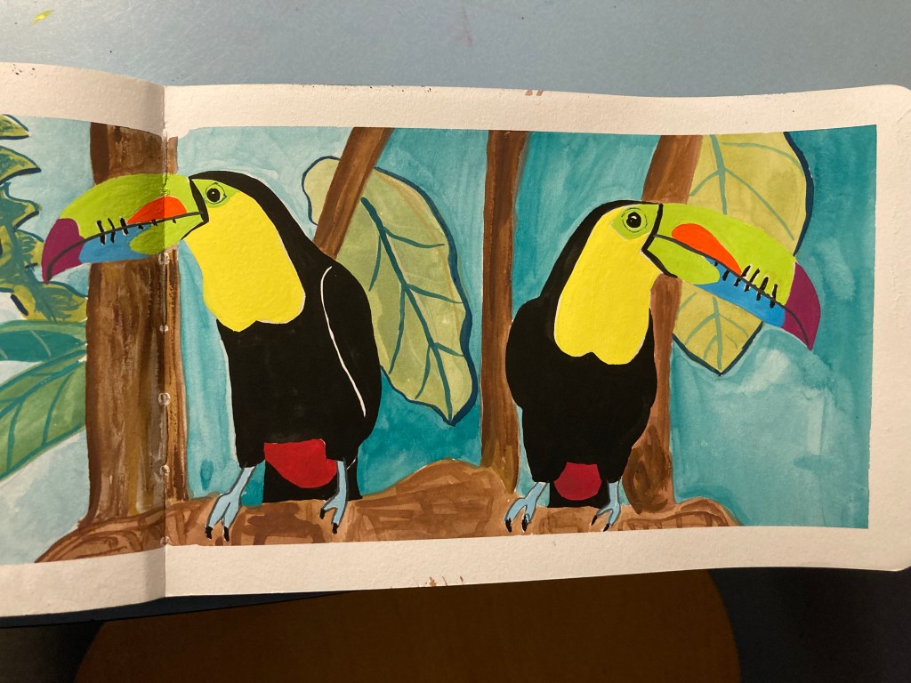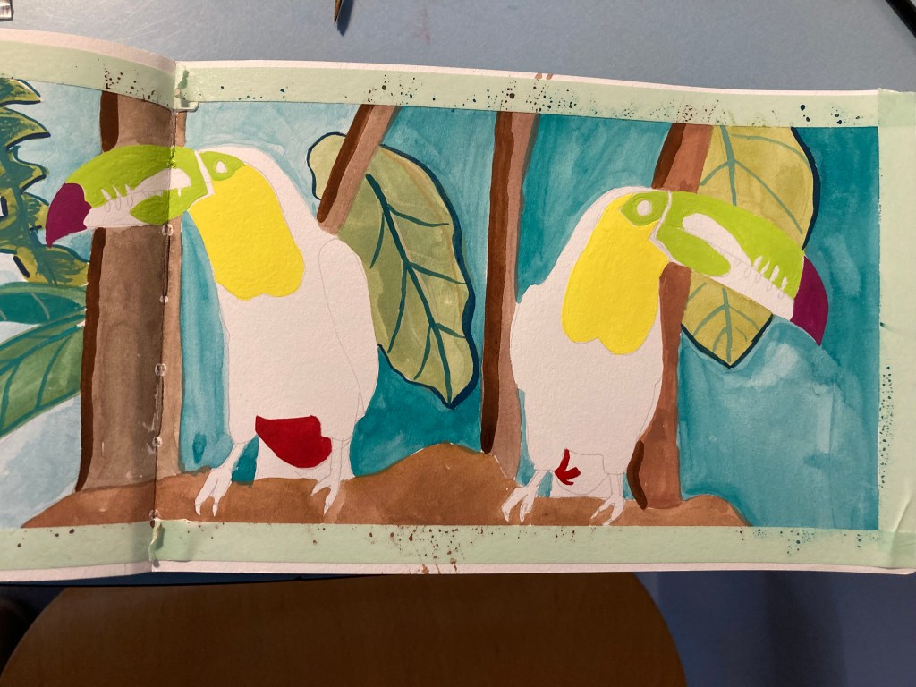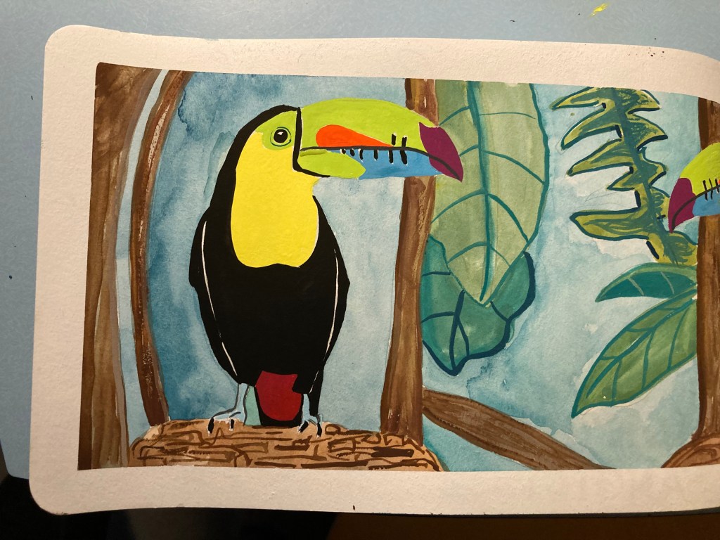 I wanted to try something colourful, and the Cornell Lab Panama Fruit Feeder Cam had some beautiful footage of an inquisitive and peckish Keel-billed Toucan, so I thought I would try a sort of hybrid of what I normally do and what I have been trying more recently, namely keep the illustration flat and 2D but add some context and background.