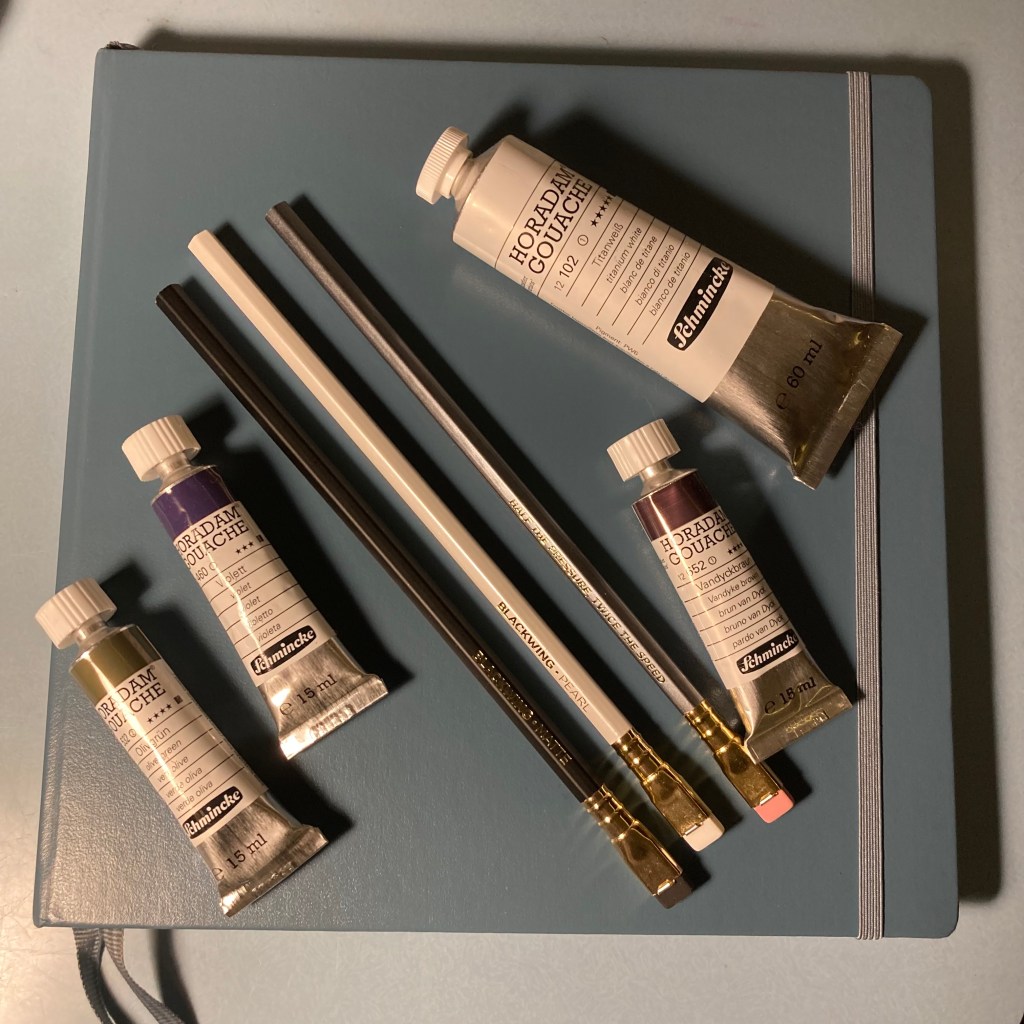 New Schmincke Horadam gouache paints, new Leuchtturm sketchbook, new Blackwing pencils. I want to start this sketchbook on January 1st – wonderful that it’s a Monday! – so I’ve been tinkering in the front pages, and swatching my paints. I don’t normally try out the paints, just dive in, but the pigments and therefore behaviour do vary and I thought it would be useful to do in advance of the art projects I’m planning for the new year. I also bought some new Fabriano paper which is a little heavier than I’ve used before as the earth pigments have been really patchy and a more absorbent weight is much more forgiving.