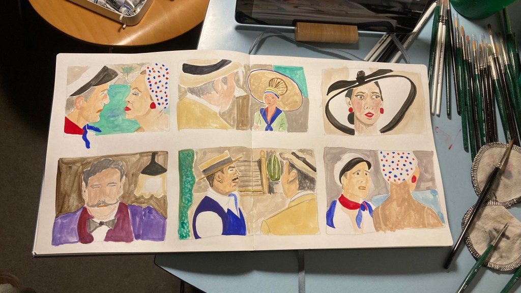 I love Agatha Christie, and over Christmas the Beeb usually shows my faves: Murder on the Orient Express, Death on the Nile, and Evil Under the Sun. Peter Ustinov is my favourite Poirot, and the 1982 production of Evil Under the Sun is priceless. I took some screenshots of particularly cinematic viewpoints, and wanted to recreate them in my Leuchtturm sketchbook in gouache.