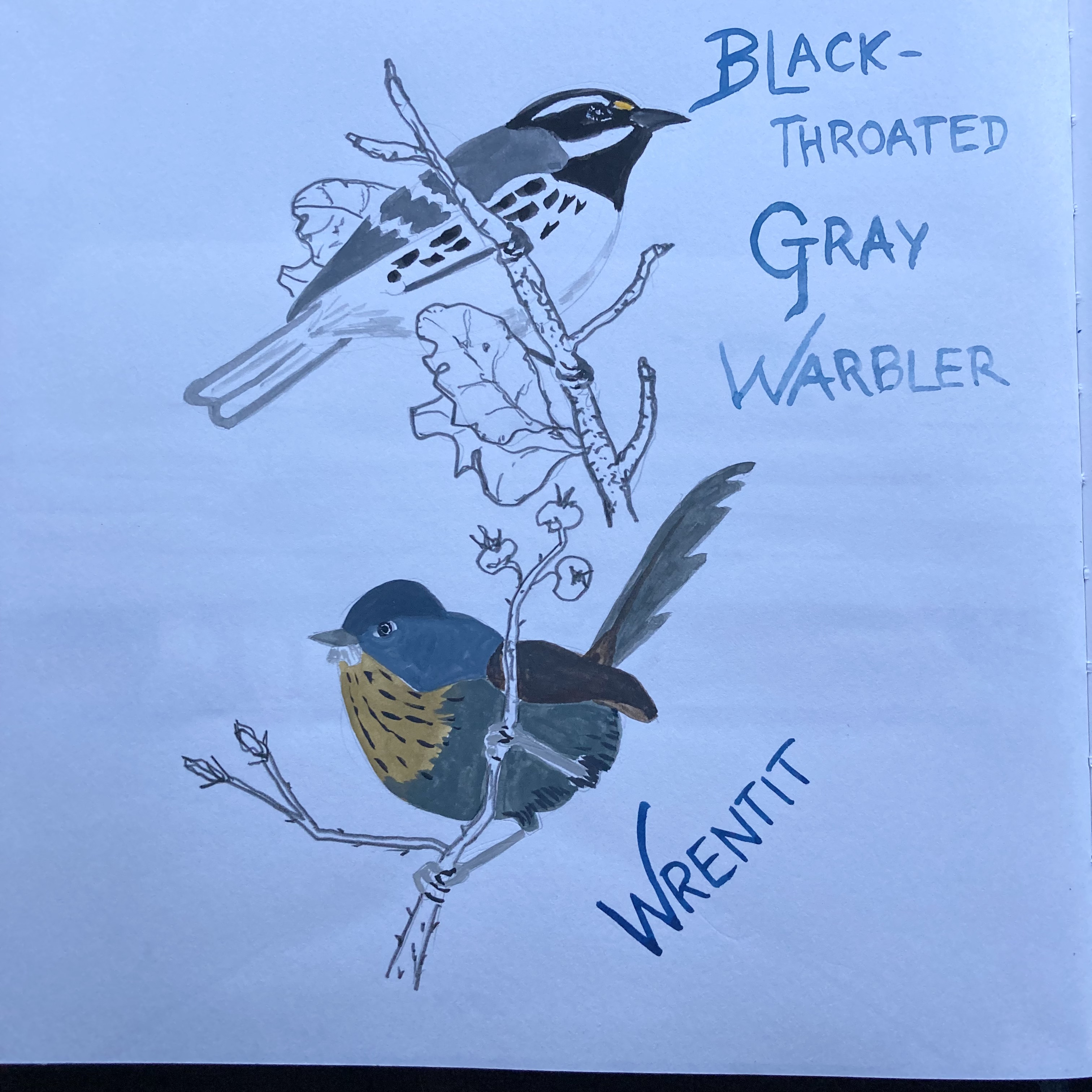 Now comes the text for each bird. I have been watching some birding videos on YouTube, and reading up about the species on the excellent Cornell Lab website, but I also got myself a copy of the Reader’s Digest Book of North American Birds which has some lovely narratives, and will give me some useful snippets of information to follow up. Plus it was only £3.50 from World of Books! I have the British Birds version and some of the illustrations are the same, but I like how the book is set out as a lot of them have the bird in colour and the peripheral contextual stuff in line/monochrome so as not to detract from the bird. I had some leftover paint so decided to recreate a couple in my sketchbook, adding pencil for the branches which was really fun.