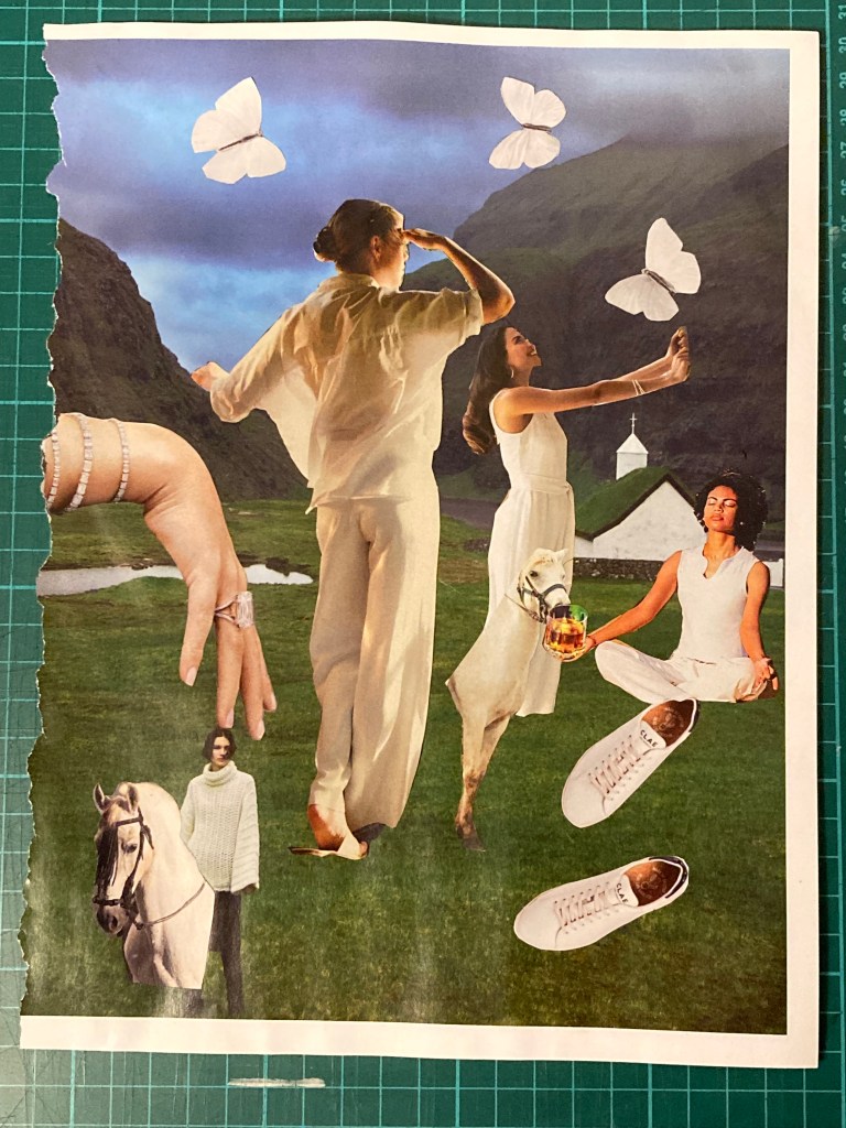 Today I watched the new Top Gun movie (I remember the first one coming out in the cinema…) while working on a page from Condé Nast Traveller magazine, my chosen resource for college. It was a fashion shoot page, set in perhaps the Highlands? Ireland? Somewhere green and hilly and windswept anyway, and there was a model wearing a white oversized sweater in one corner, and a white-painted church in the other. I started off with adding another person dressed in white, and gazing wistfully in to the beyond, and then some white butterflies, and then some white trainers. Then a pale hand with a massive diamond on one of the fingers from a Boodles ad, and I had a sort of vision of something to do with a “Searching for happiness” kind of theme. Then I found some white horses and it went a bit weird but by this time I was watching “Death Comes to Pemberley” (a BBC adaptation of the PD James novel which was very good, and a bit dark and spooky) and I was just thoroughly enjoying myself so the theme took a bit of a back seat.