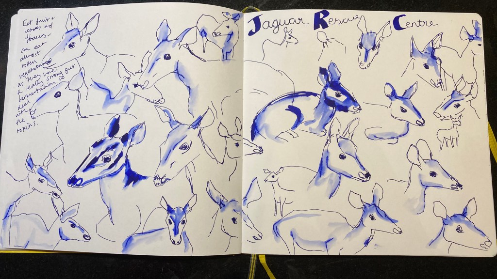 This evening I have been dog-sitting for my best friend, and was booked on a livestream with Wild Life Drawing and the Jaguar Rescue Center over in Costa Rica. I spent an hour or so drawing tropical deer which was a nice relaxing activity after my concentration and focus during the day. I only had my basic art toolkit with me so drew them in my Pilot calligraphy pen which has blue ink.