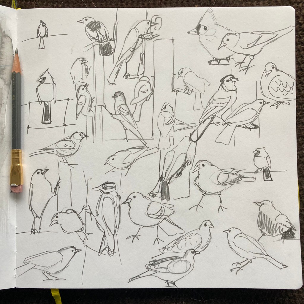 There are also some Mourning Doves, a woodpecker, a Blue Jay and a Tufted Titmouse. A Northern Cardinal was loitering on the wire fence at the back of the shot so I drew him too, even though he didn’t visit the feeders while I was watching.