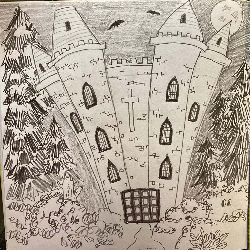 I wanted to draw a kind of spooky cartoon castle, and although I think it would look better painted with more dramatic colours, all I had was my Blackwing pencil, so this had to suffice. I envisaged something slightly Scooby-Doo-ish, and I wrapped this up in about half an hour. It could do with some more detail but the problem with graphite is that it smudges easily and I wasn’t so invested in this drawing that I was prepared to get really grubby.