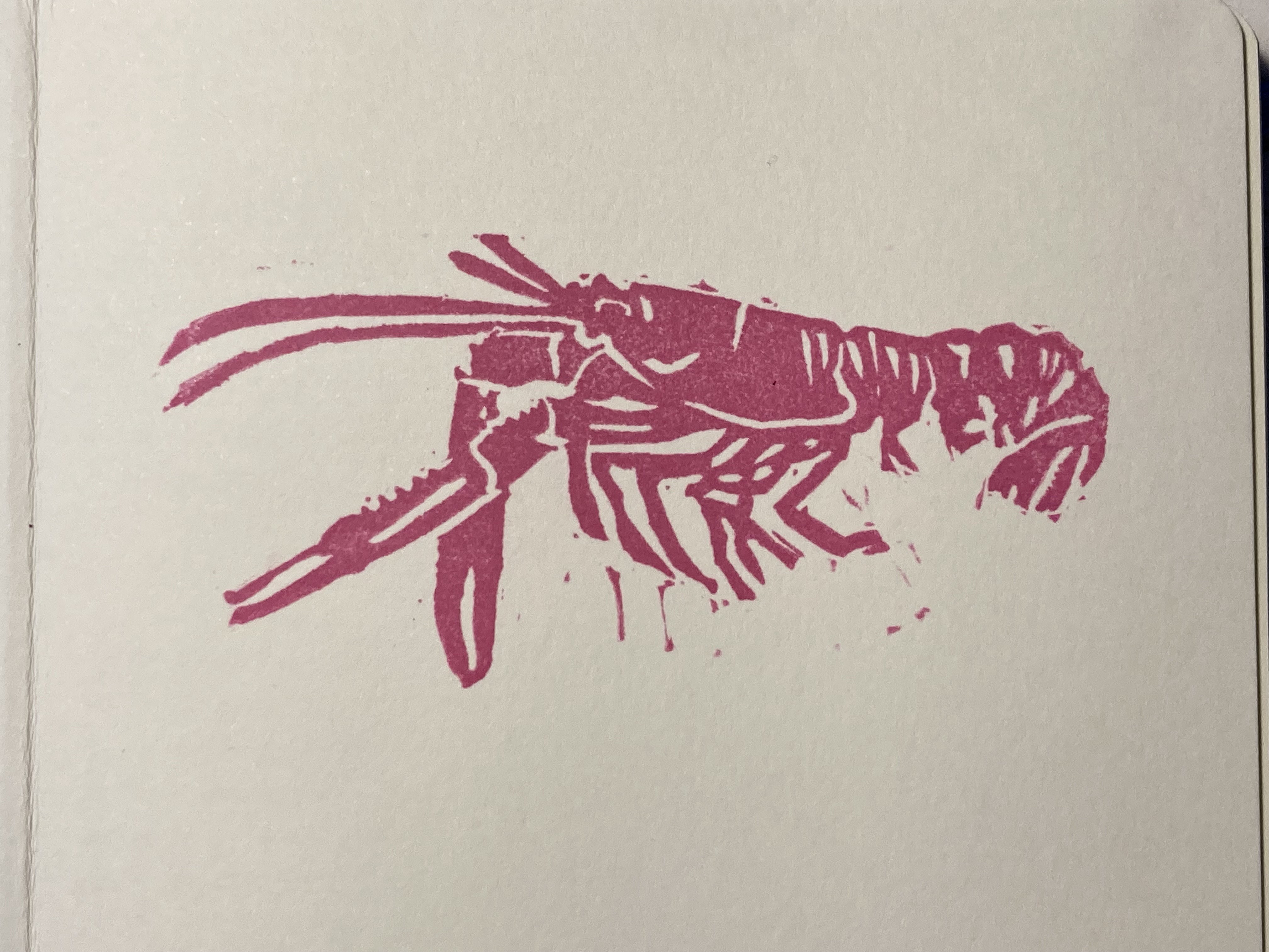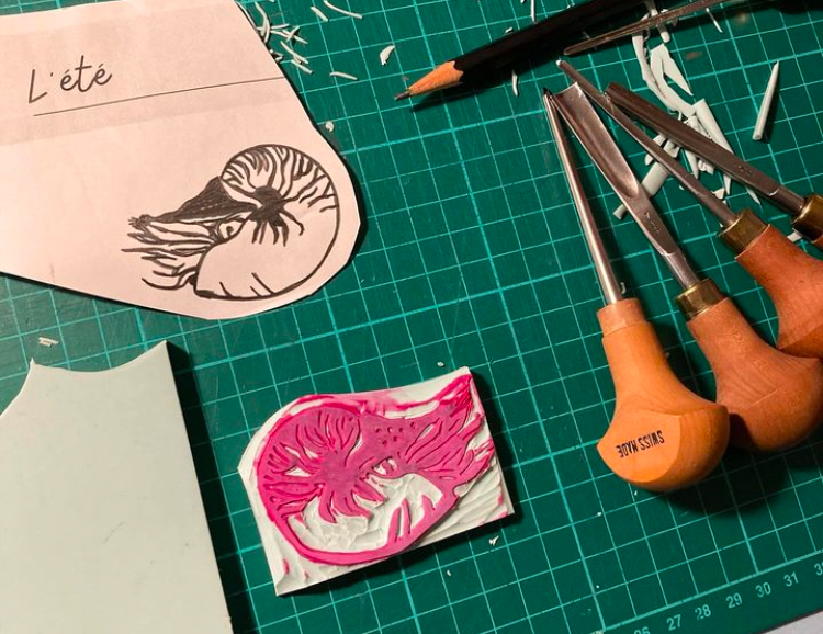 I then carved a set of stamps for my mum, a couple of little stamps for my dad, and a paw print stamp for my best friend, with an ink pad each. I sent my daughter a set of tools, some vinyl, and an ink pad as well as some motifs to practise with. I have used mine for decorating the inside of my diary: