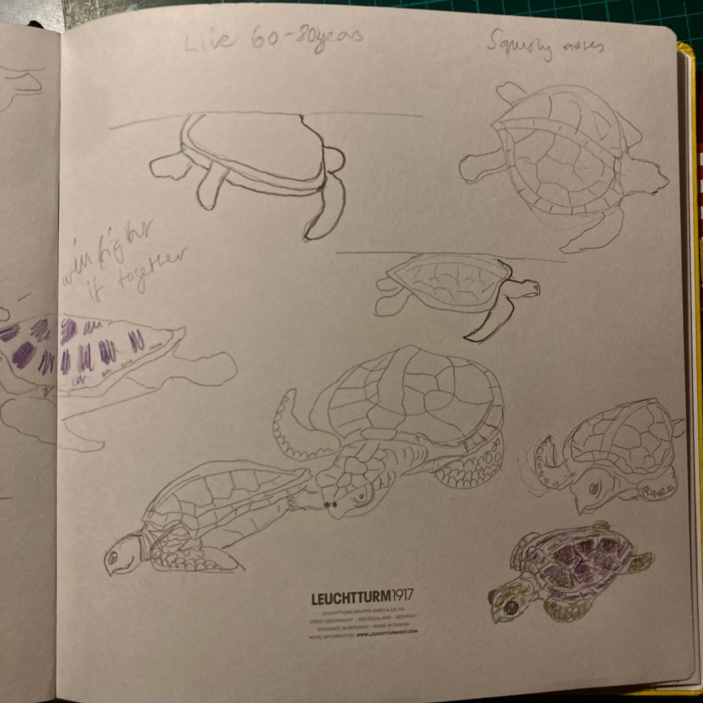 When at rest, the turtles can hold their breath for 2 or 3 hours at a time, but when feeding they need to breathe 4 or 5 times an hour. I copied some of the reference images but also took the time to appreciate Nakaly when she swam close to the windows. Neus the biologist working at the Olive Ridley Project gave us such brilliant views of the turtle in her large tank, and it was such a privilege to see her up close.