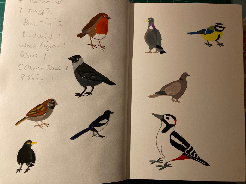 I did some little paintings of the birds I’d seen – apologies for the awful lighting (again). I was going to use one of my birdwatching logbooks but it was full! I need to get myself another one.