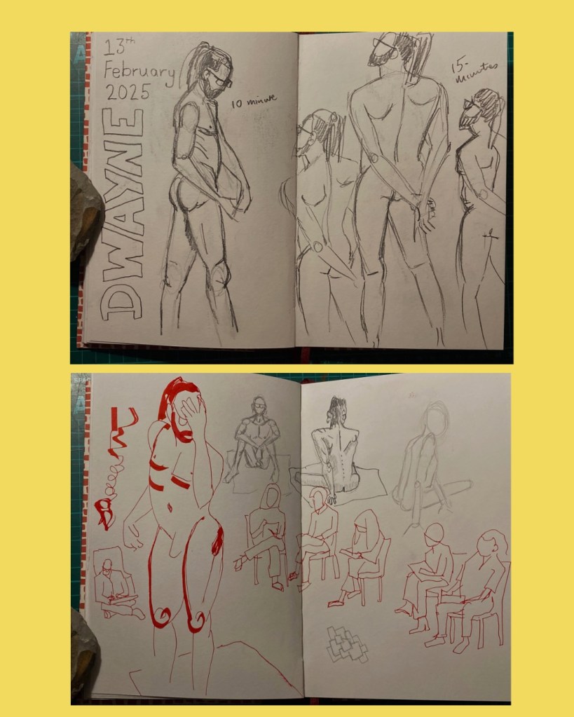 Dwayne was modelling for the 2 hour session, and as a dancer and artist themself, proved to be a fantastic subject to draw. Dancers tend to have beautifully fine musculature, and their poses have a grace and poise – and if they themselves are artists, they understand what makes an interesting position to draw so it was great to have the chance to sketch them.