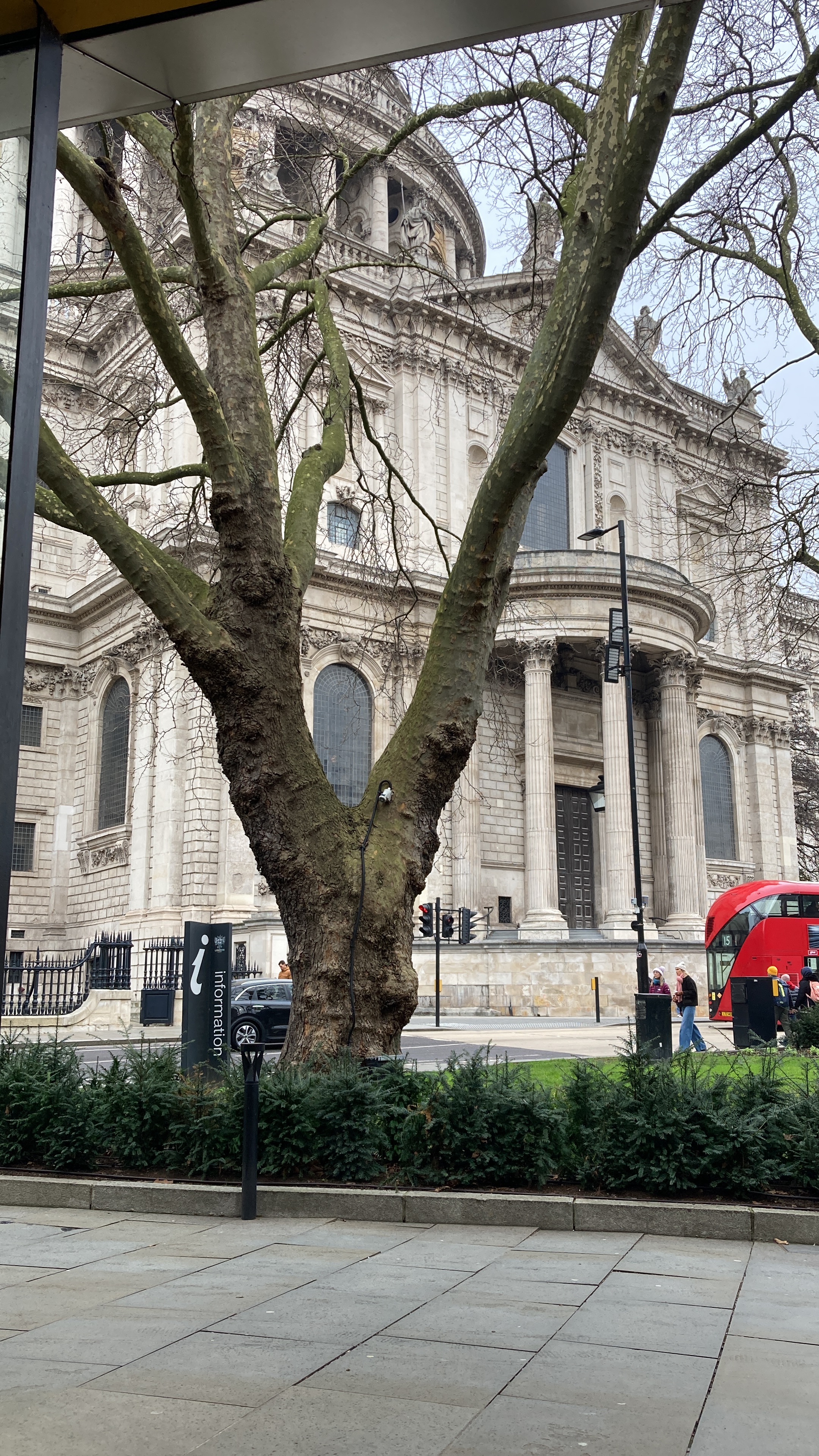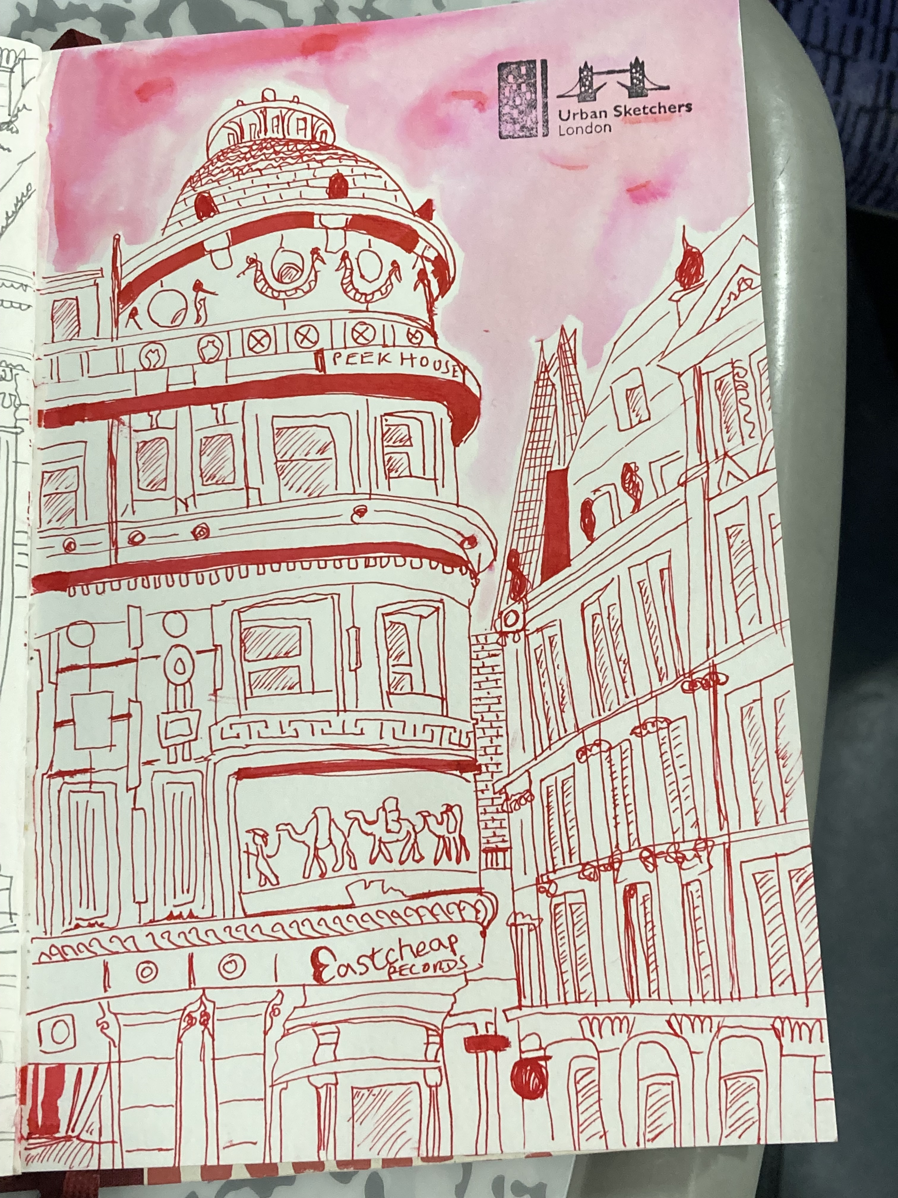 Suzy and I headed to St Paul’s but it had started spitting with rain, so we found an information hub with a bench and an overhang where we could perch and draw. It wasn’t a very interesting view but we managed to get something in our sketchbooks.