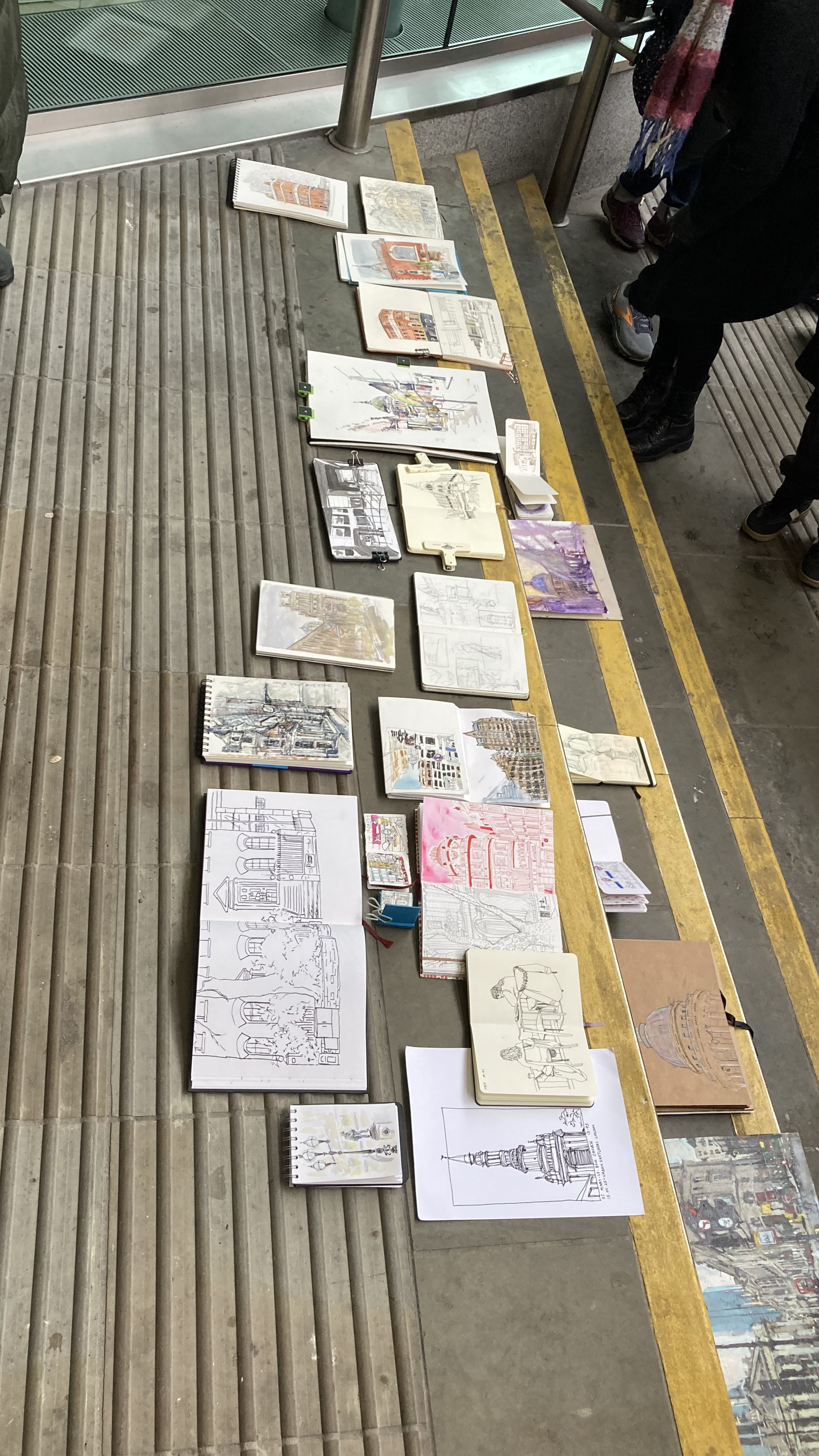 Halfway through, we met back at Cannon Street to have our midpoint sketchbook throwdown. There were so many people I couldn’t get a photo of everyone’s work, and for the second part of the session most of us decided to find a coffee shop or other cosy venue with a view.