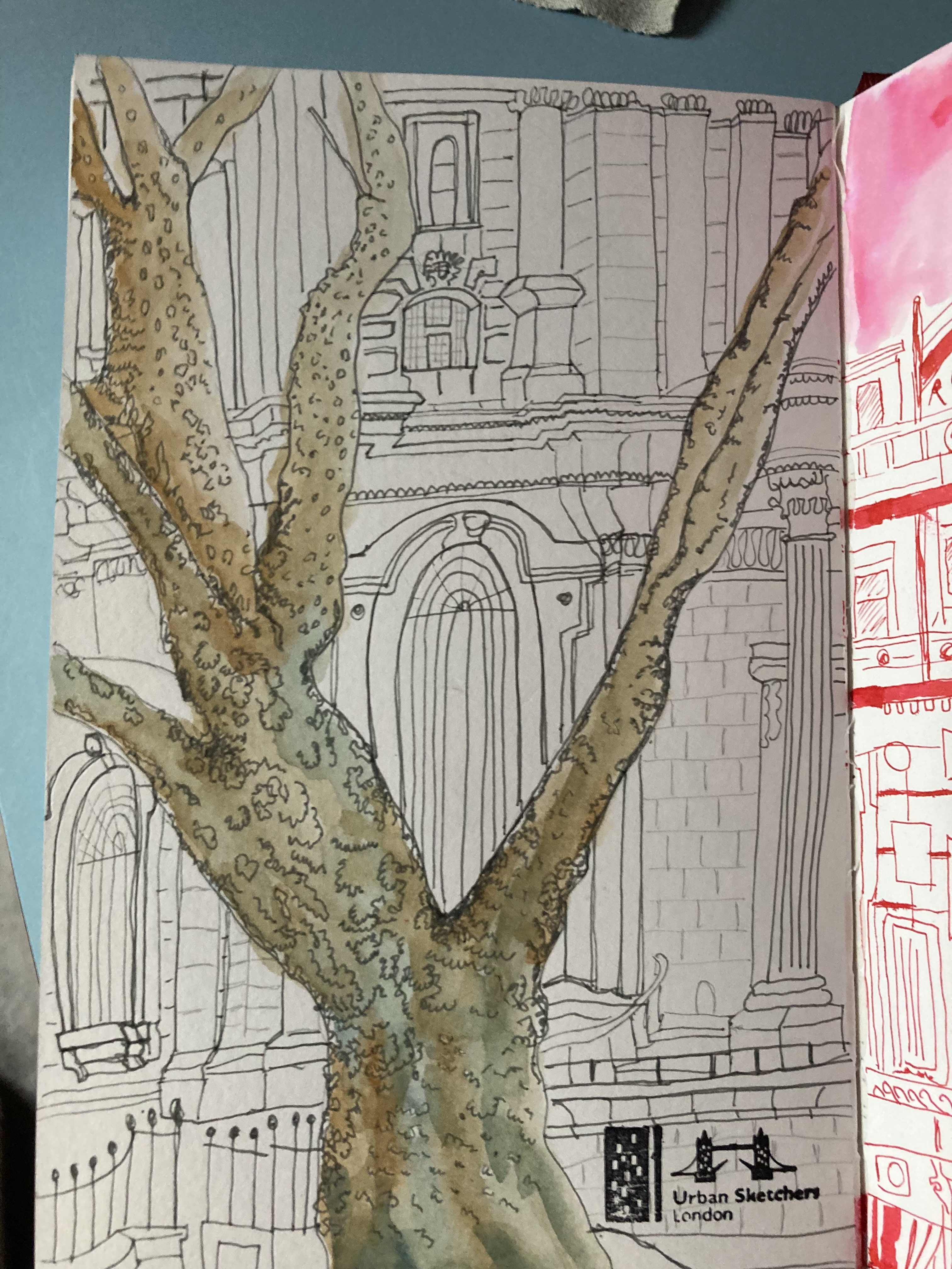 Brr it was a chilly day for sitting outside sketching! Fortified with a wonderful plant-based full English at Mallow just by Borough Market, I headed over London Bridge to meet my friend Suzy who was coming up from Kent for this February meeting of the London urban sketching group. There were at least 70 USkers outside the underground which was a pleasant surprise.