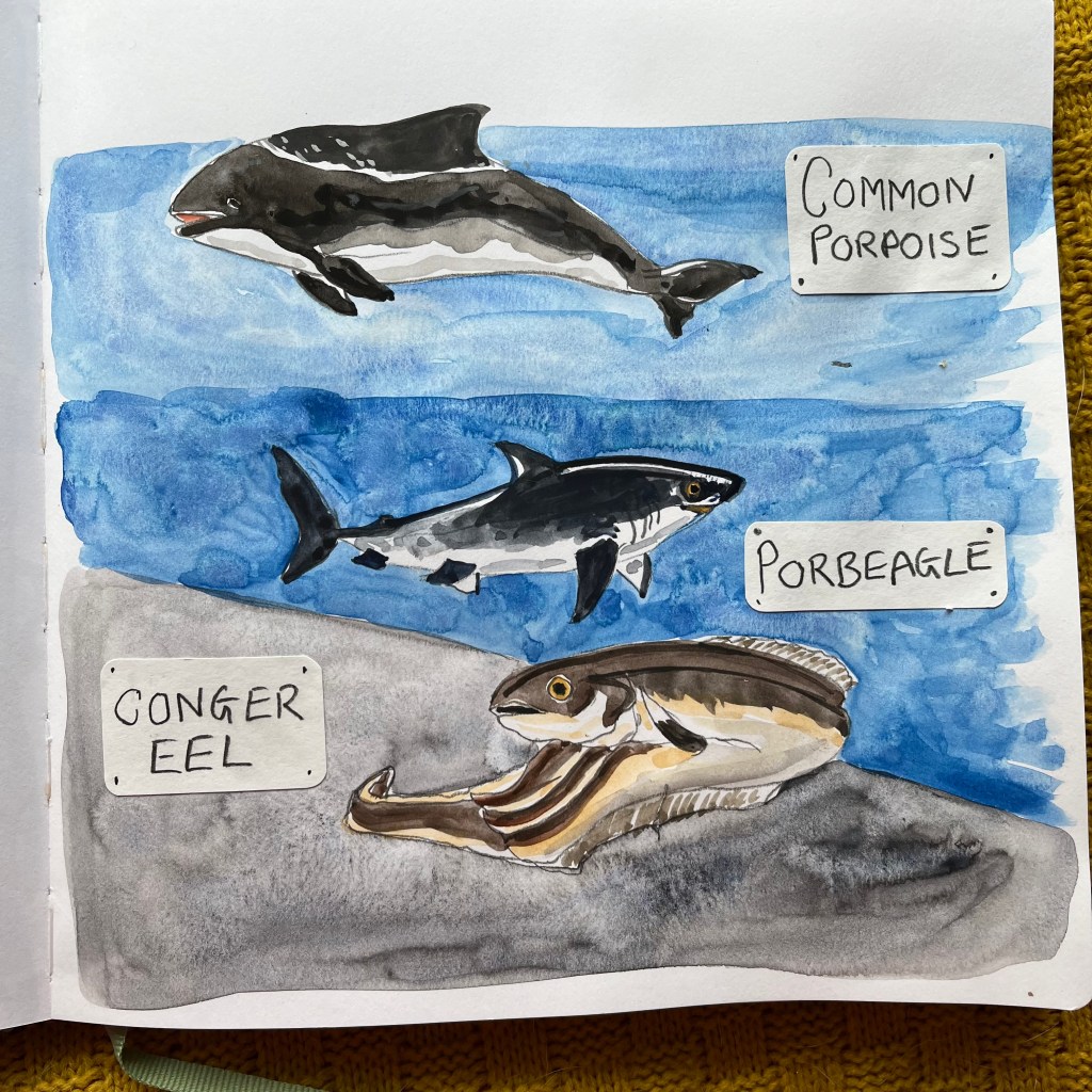 Here I’m using Deep Sea Blue with lots of water for the porpoise; the same paint with a little less water for the porbeagle; and the Deep Sea Black for the conger eel.