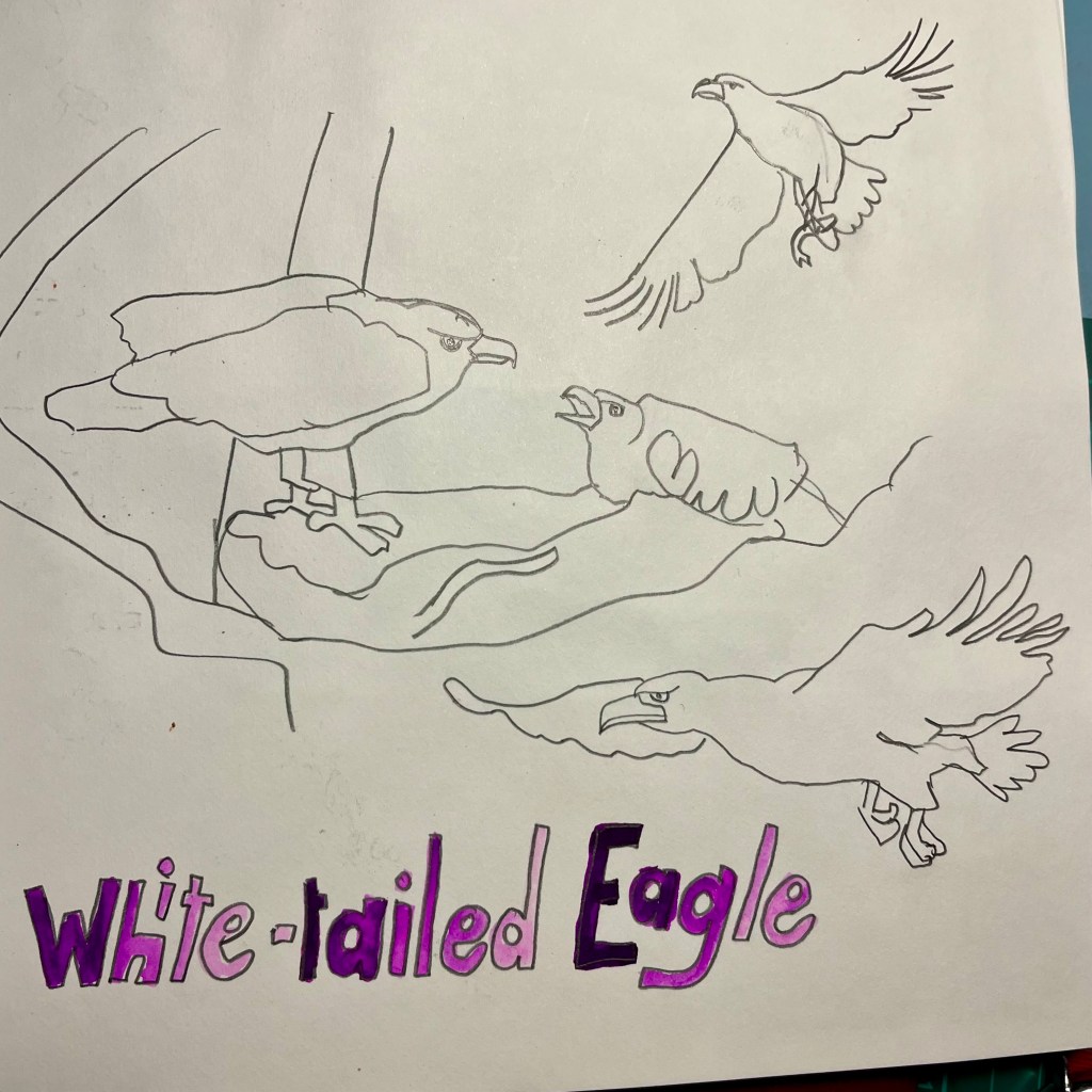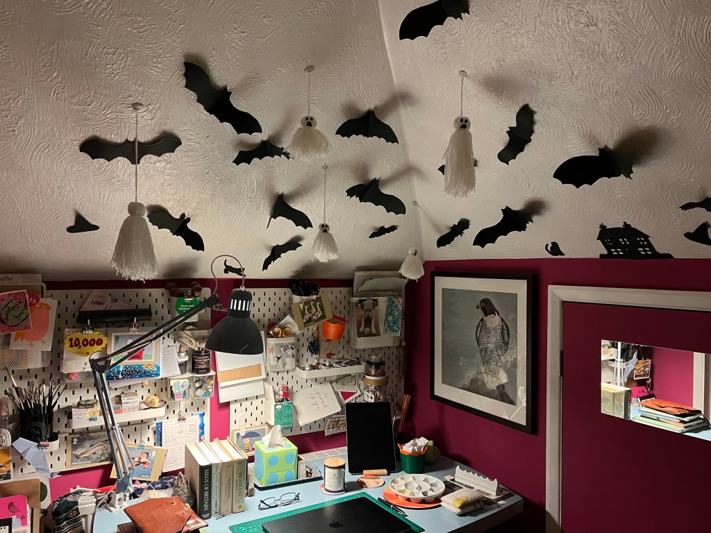 I’ve been struggling with mild yet persistent migraine symptoms for the past few days so I don’t feel that I’ve achieved much as it takes a fair amount of focus to remain upright and functioning, but I have been endeavouring to do some Inktobers with Sketchbook Skool and birds of prey (see below). As a craft activity with my daughters, we made bats from black card, and ghosts from white yarn. My eldest daughter has realised the practicality of decorations which can be stored flat, and as both my younger daughter and I live in small spaces, this suits us too. My little studio corner has become wonderfully spooky, especially when lit from underneath: