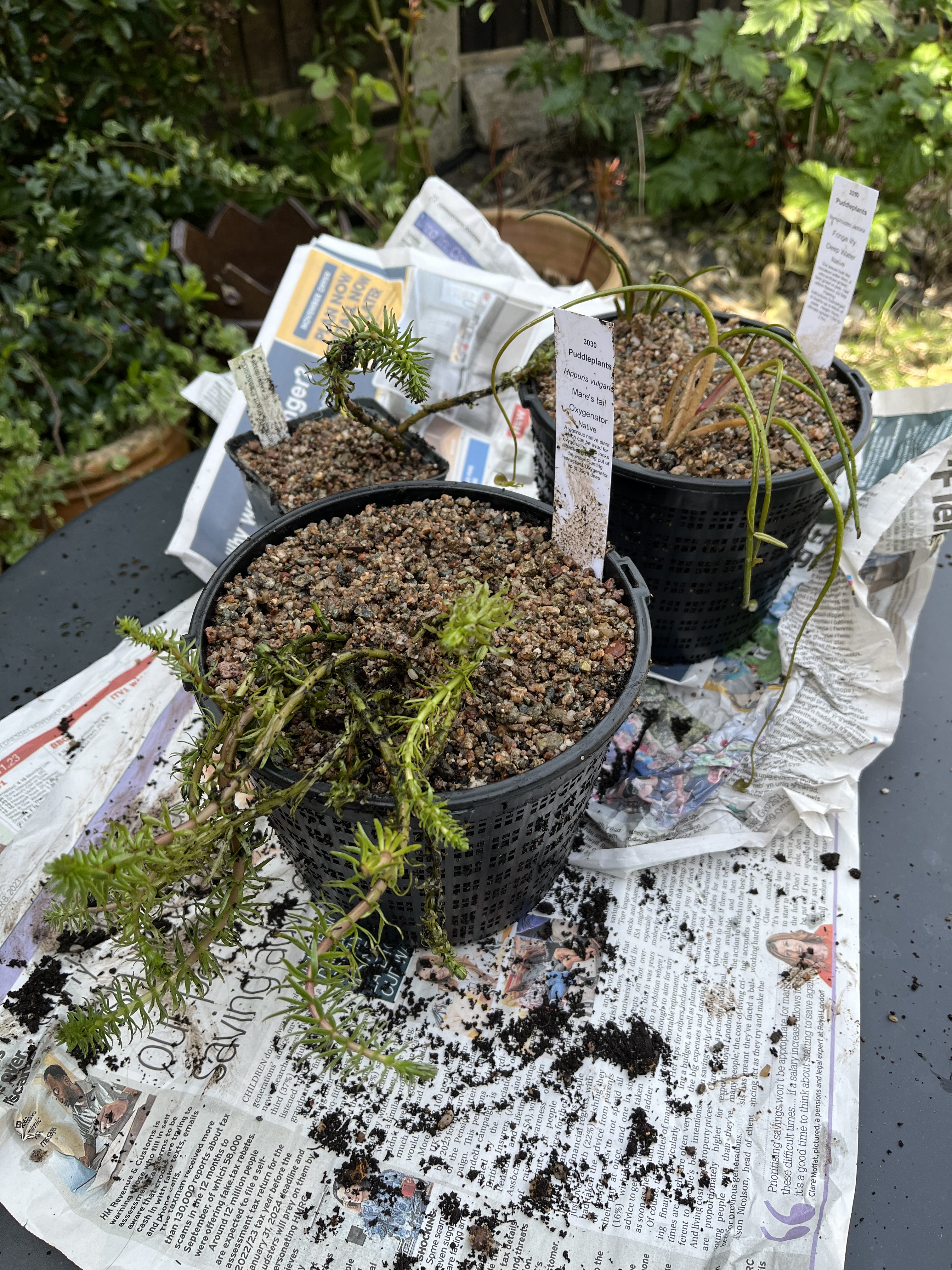 I potted up the plants and topped them with gravel. I had a bit of soil left over so I took off a bit of the Mare’s Tail and made a tiny pot for a flowerpot pond. I then put them in their new home: