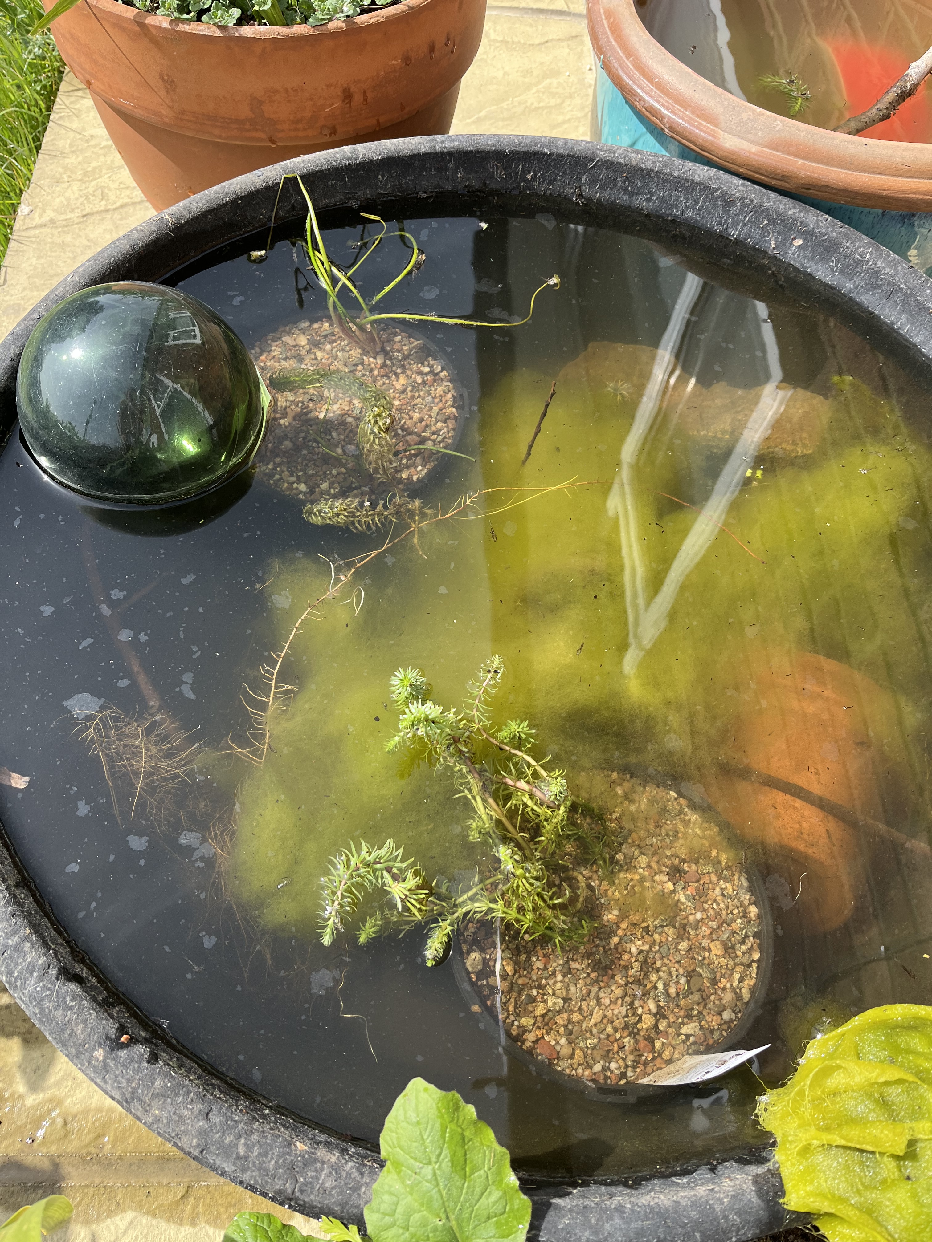 As I’ve mentioned before, there are a variety of ponds in our garden, and I wanted to give the feed bowl pond a bit of a makeover. It currently has some pond weed and a broken flowerpot to provide some shelter, as well as a large stone for things to hide on or under. It really needed some plants though, and although I wanted a water lily, it’s a bit too shallow and there’s only one native variety and they seem to be quite scarce at this time of year. I’m not sure if that’s a dormancy/availability thing or they’ve all sold out, but in any case, I couldn’t find one. I also wanted an oxygenating plant of some description.